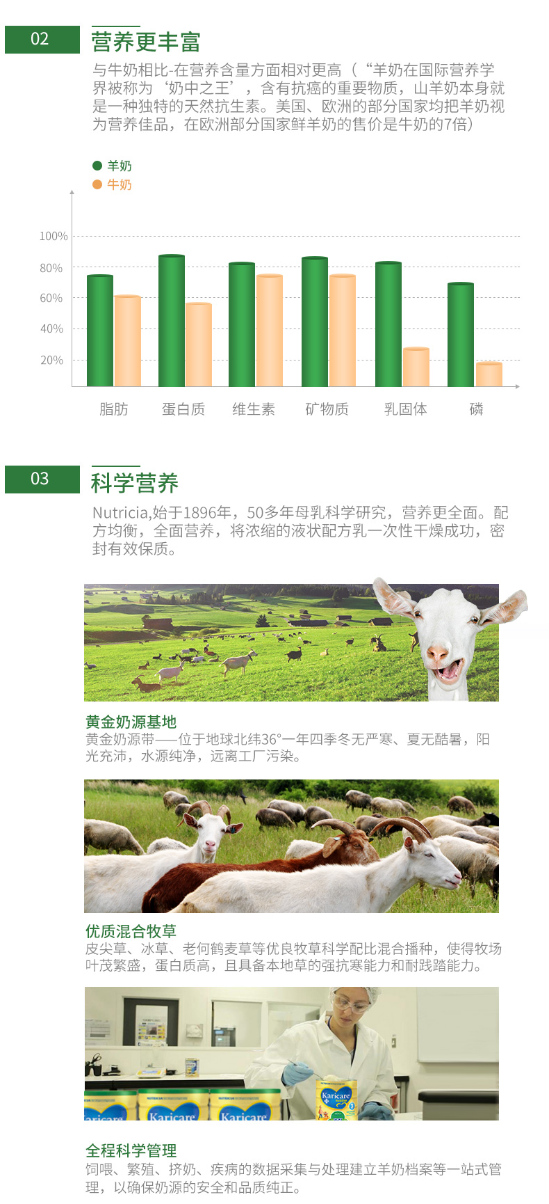 【产品介绍】Karicare 可瑞康 婴幼儿配方山羊奶粉中的蛋白质、矿物质,钙磷的含量都比牛奶略高,维生素A、B含量也高于牛奶,对宝宝保护视力、恢复体能有好处。羊奶比牛奶更营养全面,羊奶的脂肪球与蛋白颗粒只有牛奶的1/3,更容易消化,不易发胖。Karicare 可瑞康 婴幼儿配方羊奶粉可解除大部分牛奶蛋白质引起的过敏症,对宝宝的湿疹也有很好的缓解效果。口感比牛奶清淡,奶味更浓醇,无膻味。补充了叶酸和铁,很好的解决了鲜牛奶缺铁缺叶酸的情况。更容易吸收营养,促进脑部及视力发育,让宝宝拥有更聪明的大脑和灵敏的视觉。