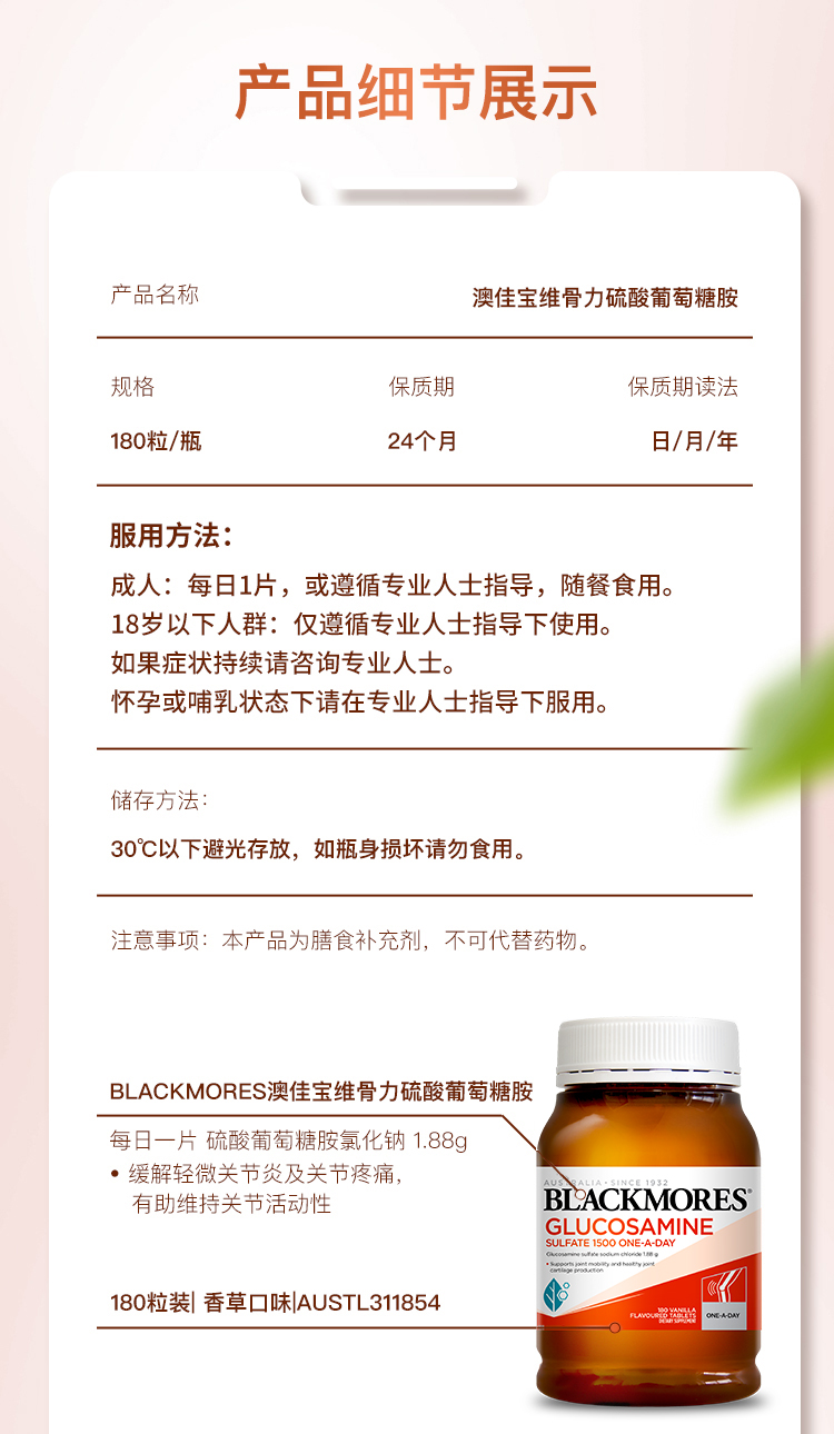 补充关节滑液#减少软骨磨损#修复软骨(结缔组织)#修复受损关节#减轻炎症#Blackmores 澳佳宝维骨力关节灵180粒 含1500mg氨糖#Blackmores 澳佳宝维骨力关节灵180粒 含1500mg氨糖#Blackmores 澳佳宝维骨力关节灵180粒 含1500mg氨糖#