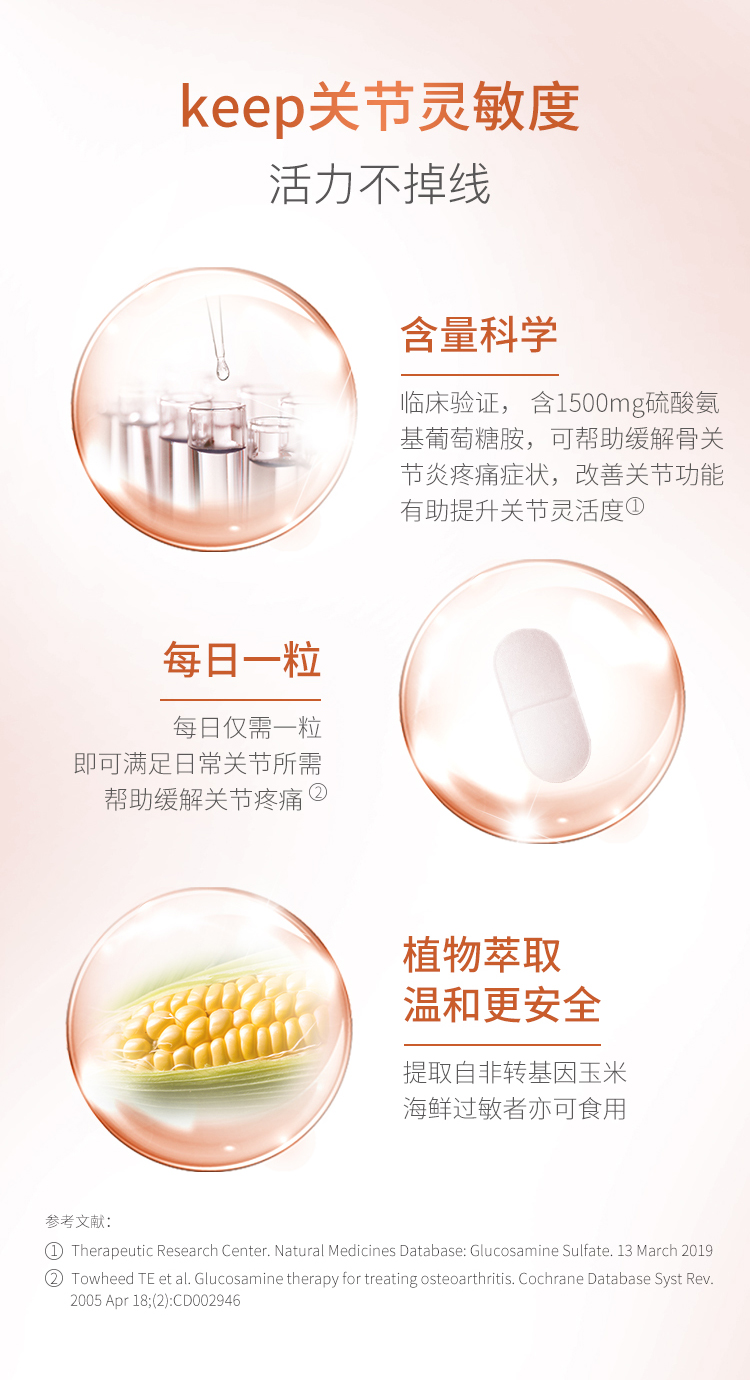 · 葡萄糖胺浓度高,剂量经临床验证。 2-4个星期可以见到效果。