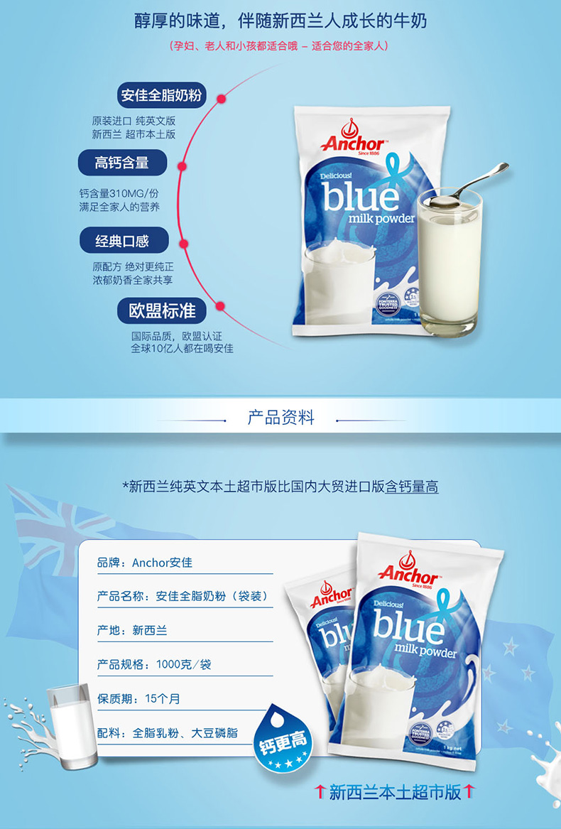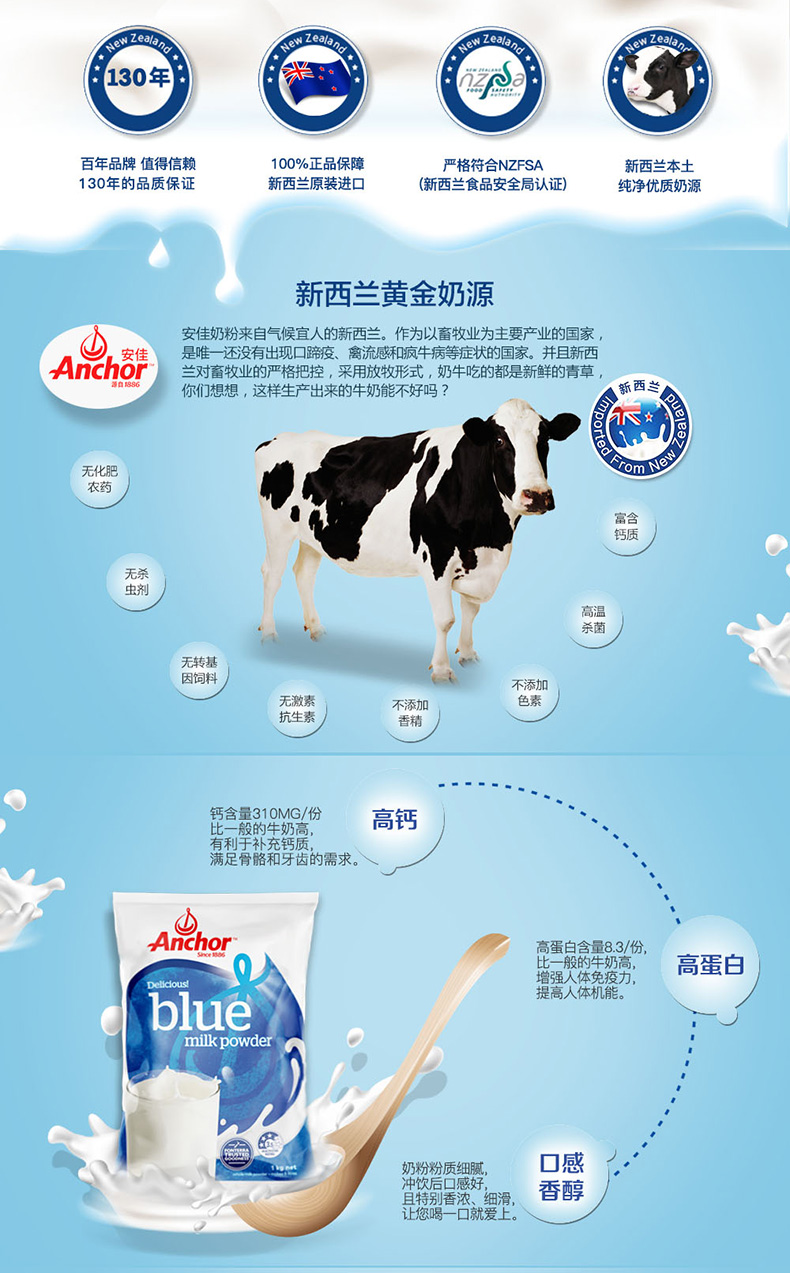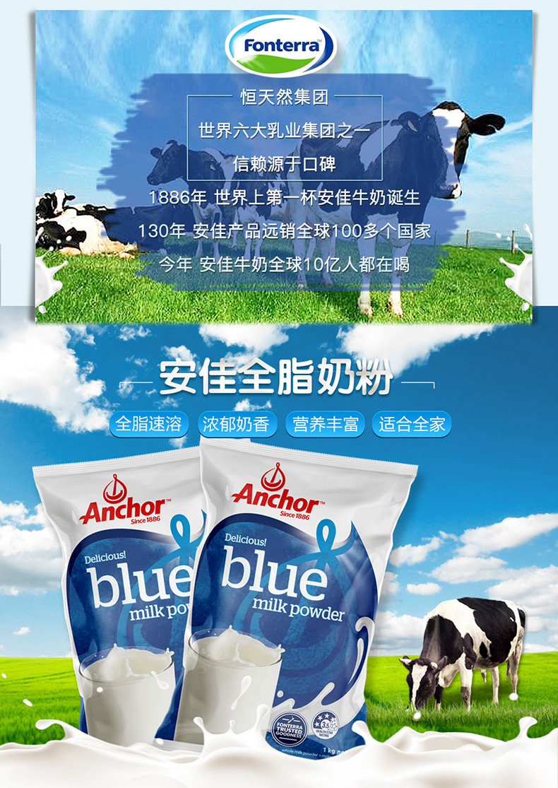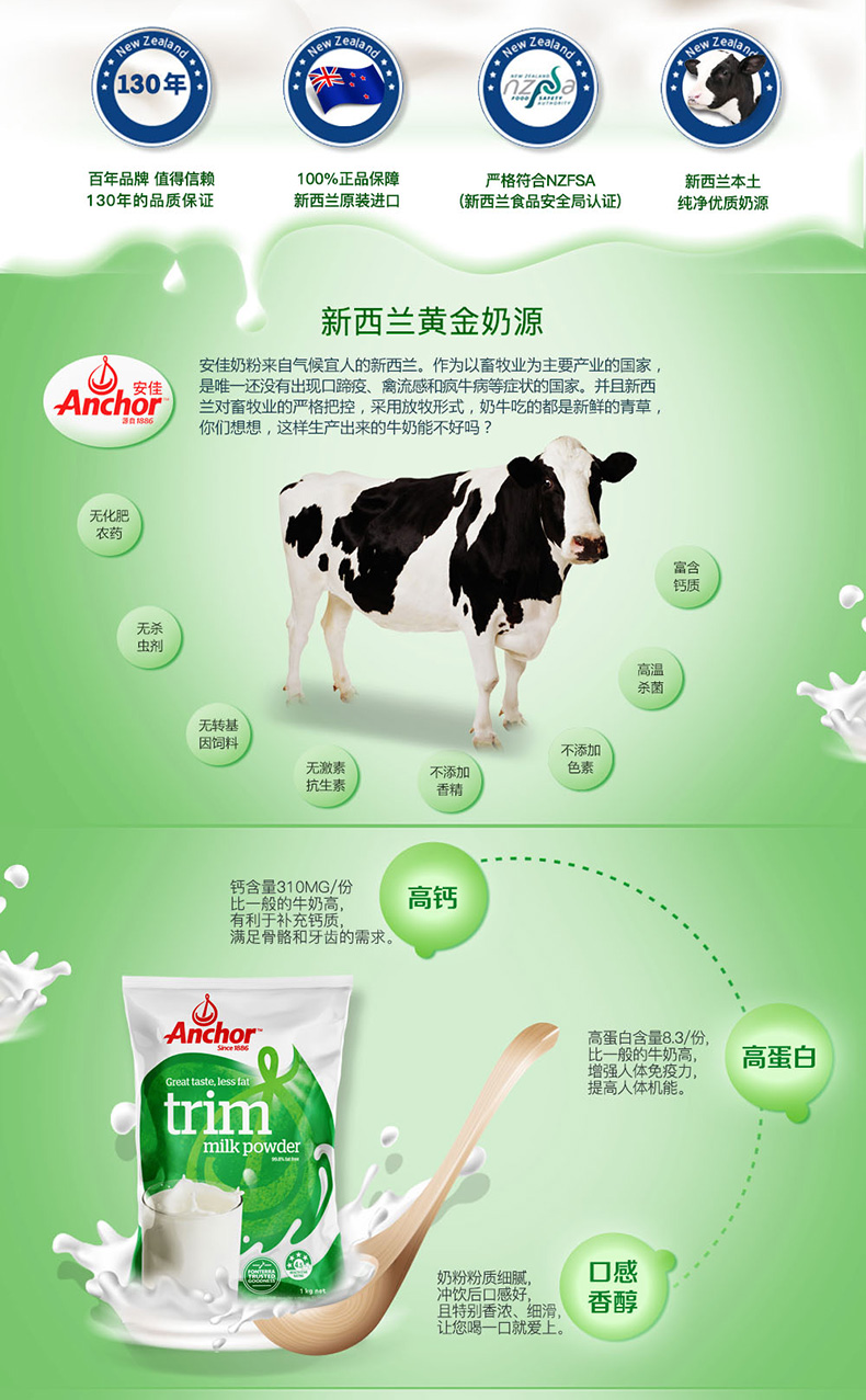 【产品介绍】Anchor安佳是新西兰家喻户晓的牌子,新西兰气候宜人,阳光充足,无污染,生态环境非常好,畜牧业全部是以露天放养方式,不作畜栏或限制谷仓喂养,没有使用任何生长激素。浓郁的奶香味,不上火,而且一冲就化开了,口感细腻有营养,是新西兰本地民众普遍享用的品牌,是适合从儿童、年轻人到老年人每天摄取营养的最佳来源之一。