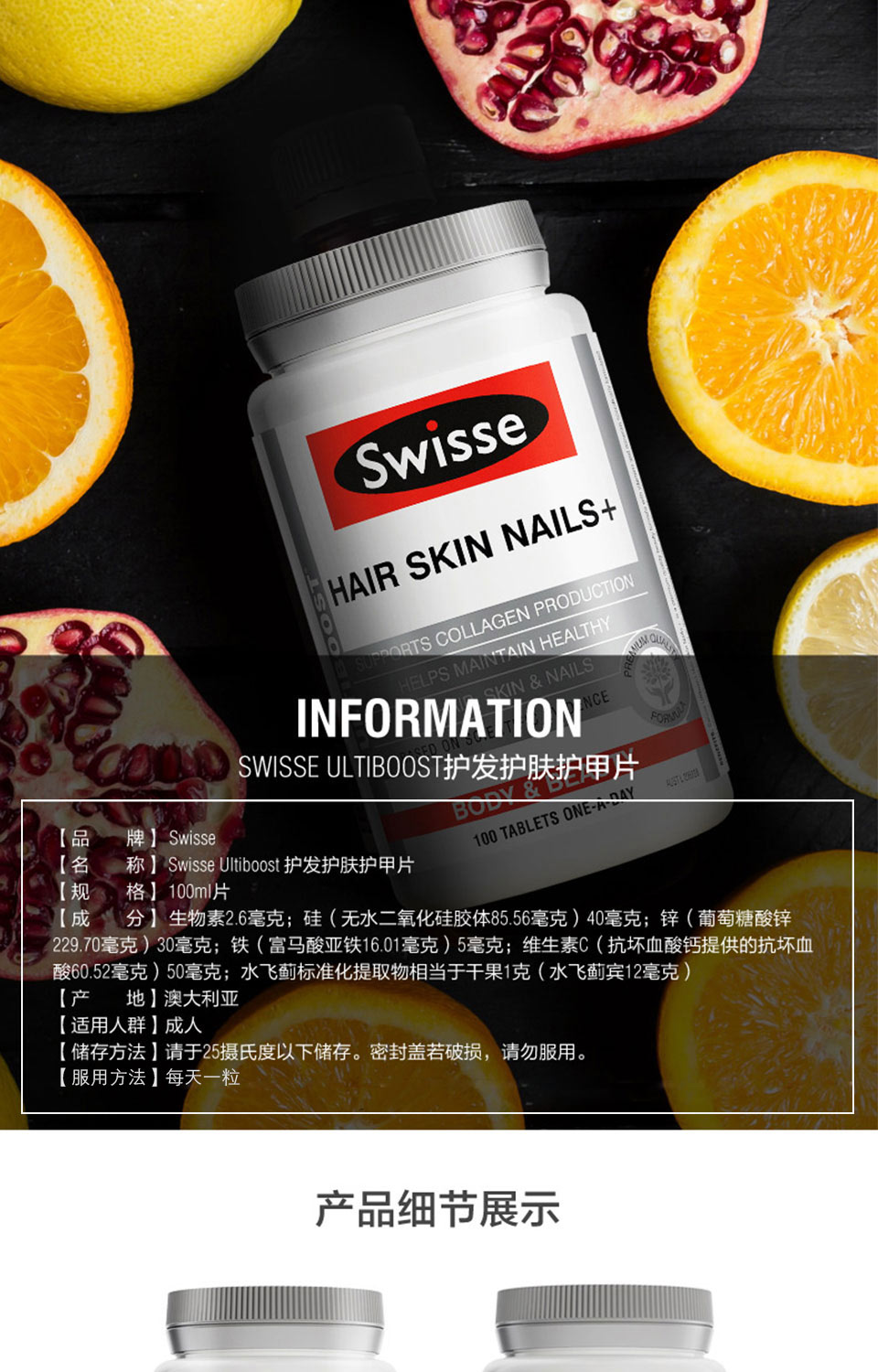 【产品介绍】Swisse 胶原蛋白片(美容养颜防皱)使用科学配方,含高质量营养成分支持胶原蛋白的产生,提供头发、皮肤、指甲必需的营养。配方中包含生物素能增加指甲的柔软度,减少指甲断裂;含亲水性的天然保湿因子,强劲锁住水分,让皮肤时刻保持湿润、水嫩的状态;透过角质层与皮肤上皮细胞结合,参与和改善皮肤细胞的代谢,使皮肤中的胶原蛋白活性加强,滋润皮肤。