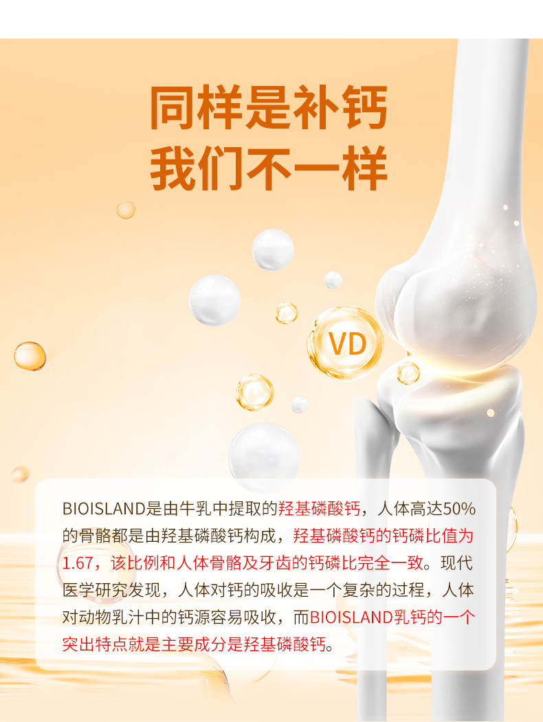 【产品介绍】Bioisland天然液体牛乳钙骨健康胶囊配方中强大黄金搭档组合(乳钙+维D+维K),将补钙、吸收、锁钙同步完成。澳洲BIO ISLAND 天然牛乳钙骨保健胶囊中的钙质来源于新西兰纯净的牛乳中提取的天然牛乳钙,可有效的被人体吸收。钙是骨骼发育和维持骨骼、牙齿、肌肉的收缩和神经传递的重要矿物质,在生命的各个阶段都需要钙的补充都尤为重要。在青春期,怀孕期间和哺乳期,妇女绝经后,中老年阶段,需要最大限度地保持稳定的摄入和吸收钙质提高骨骼结构的强度。同时,含有的维生素D3能提高促进体内钙的吸收,有效减少因饮食中缺乏钙及钙不能有效吸收所导致骨质疏松。每粒胶囊含有维生素K2将补充和吸收的钙质与人体骨骼中本身含有的钙充分结合提高骨密度,强大支持锁住补充的钙质,避免钙质的流失。