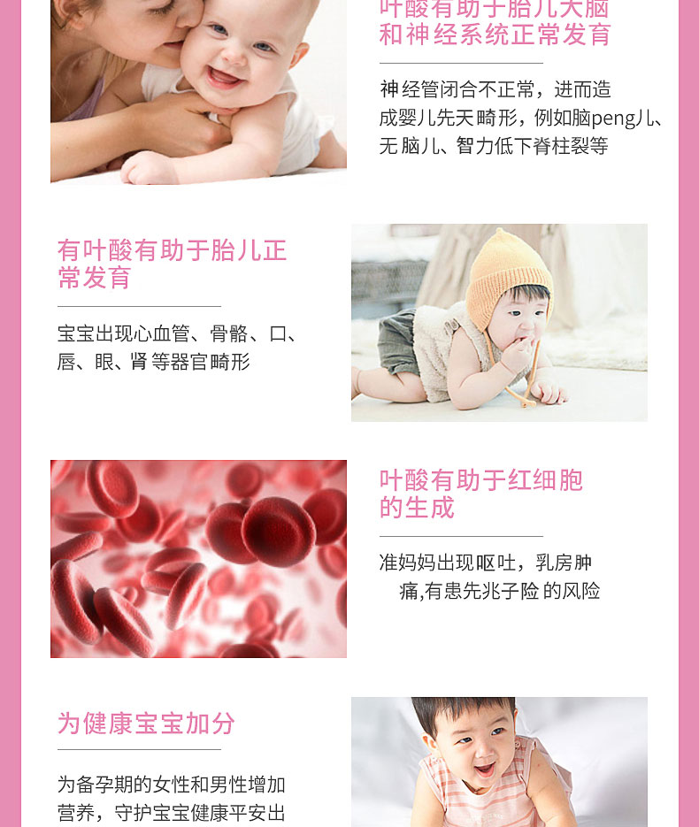 【产品介绍】为孕前及孕中女性们推荐的首选产品,是孕前和孕中女性们的贴心宝贝。于计划怀孕前1到3个月起,以及怀孕初期每日服用,可有效降低胎儿出现脑部缺陷和脊髓缺陷(如脊柱裂)的风险。同时叶酸也是正常血红细胞生成的必要元素。