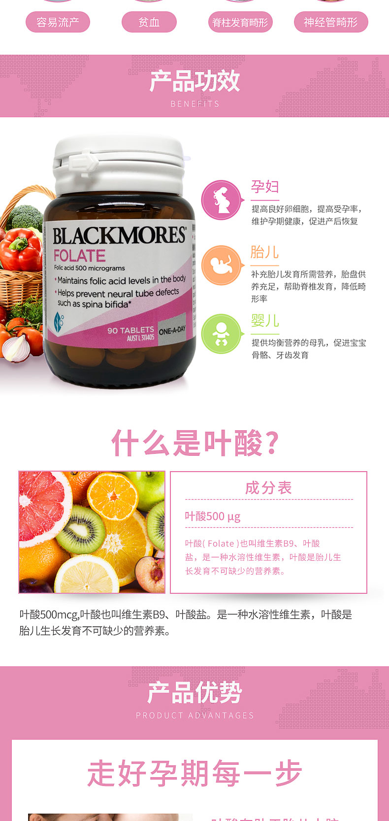 此产品提供每天500mcg剂量的叶酸,如果怀孕前一个月和怀孕期间每天服用,可以减少新生儿大脑或脊髓受损的危险,叶酸在维持正常供血方面也起到了一定作用。