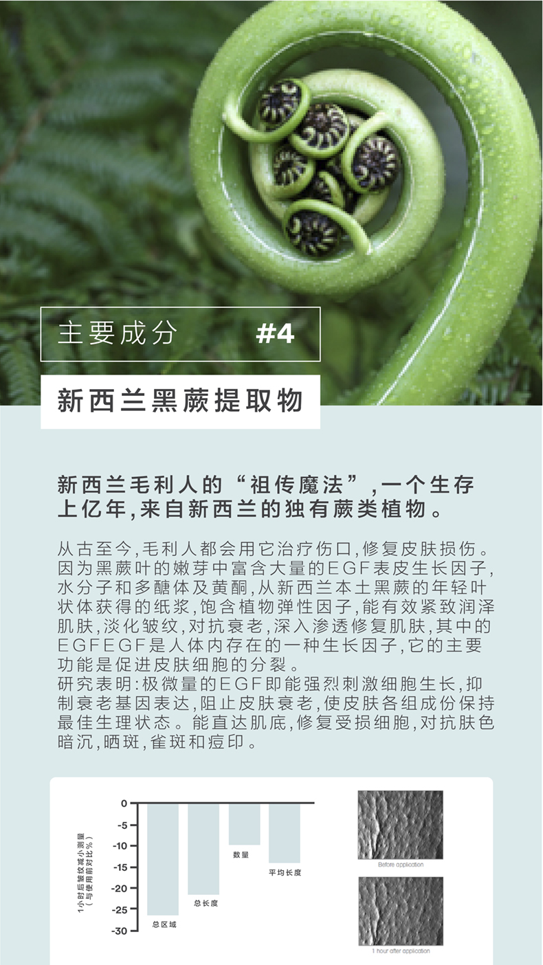 Syrene片状面膜配方中的新西兰黑蕨,嫩芽中富含大量的EGF表皮生长因子,具有抗氧化和修复功能,修复由于紫外线和低湿度等环境因素引起的皮肤损伤,深层补水修复,补充胶原蛋白,平衡油脂,从而使皮肤重返年轻状态。