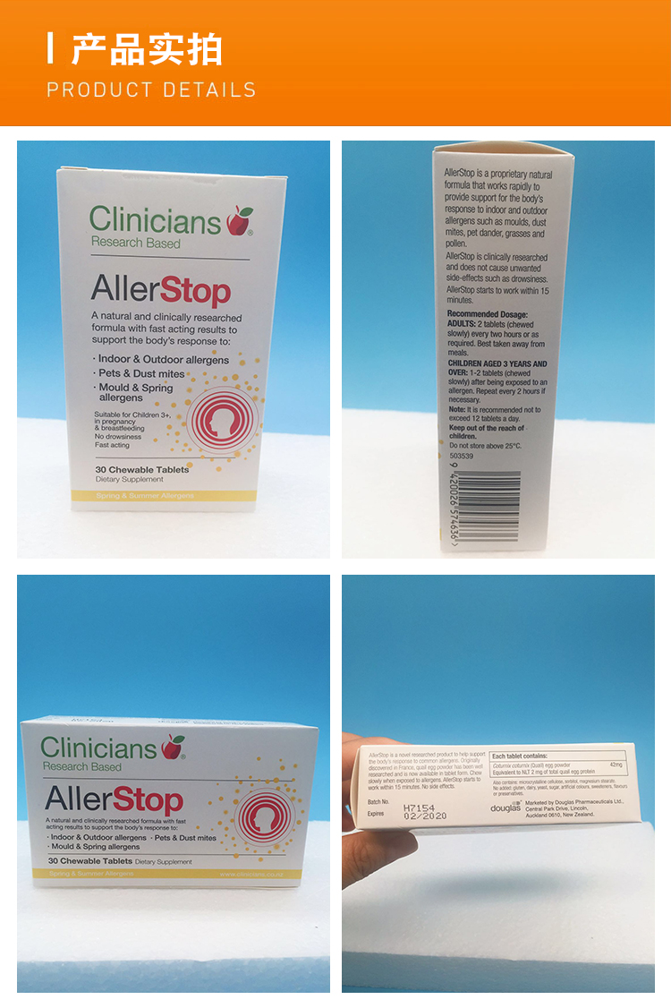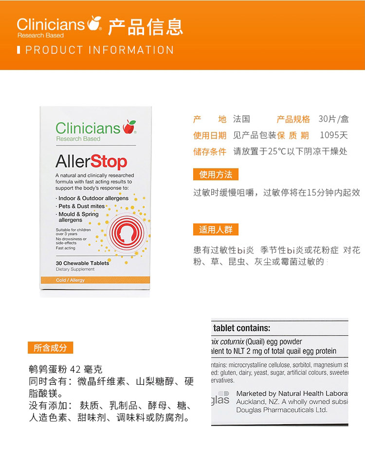 【产品介绍】Clinicians 科立纯 过敏停咀嚼片中的AllerStop,是一种专有的天然配方,能迅速提供为身体抵抗室内和室外过敏原,如霉菌、尘螨、宠物皮屑、草和花粉。Allerstop含有特殊的蛋白质,这中蛋白质是从鹌鹑蛋分离出来的;它能有效的保护鼻腔受过敏原的刺激。