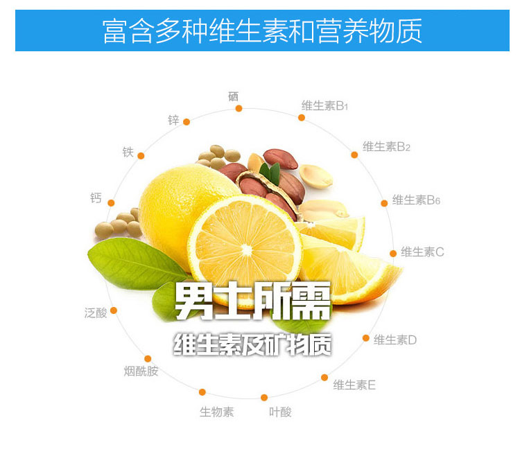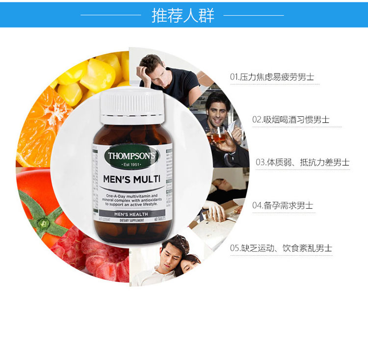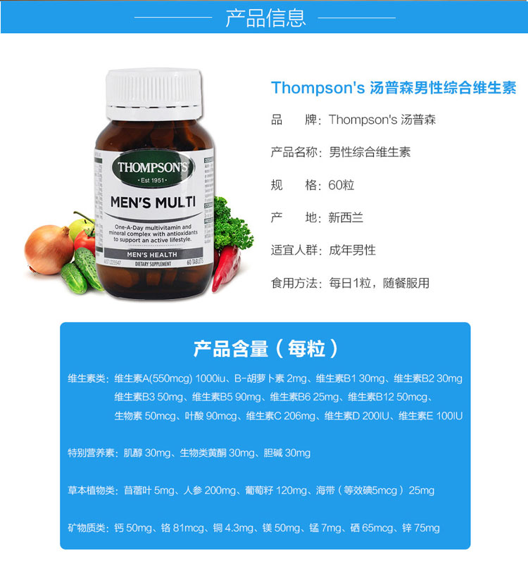 【产品介绍】Thompson 汤普森男士复合维生素,专为男性所需营养特殊设计,全方位蕴含多种男性所需的营养素,充分给于必需的关怀,最大的特点是尤其含有多种消化酶,帮助吸收消化。还富含维生素和矿物质,特别添加锌、硒及人参,帮助减少疲劳缓解压力,提高能量输出帮助维持男士出色的表现,帮助肝脏解毒促进身体免疫系统全面健康,防护多种疾病,帮助抵御自由基的侵害,使男士精力充沛每一天。使男生精力充沛,帮助全身的血液循环,还可以调节体内新陈代谢。缓解疲劳和压力,提高抵抗力。助维持男士出色的表现,帮助肝脏解毒促进身体免疫系统全面健康,防护多种疾病。帮助抵御自由基的侵害。