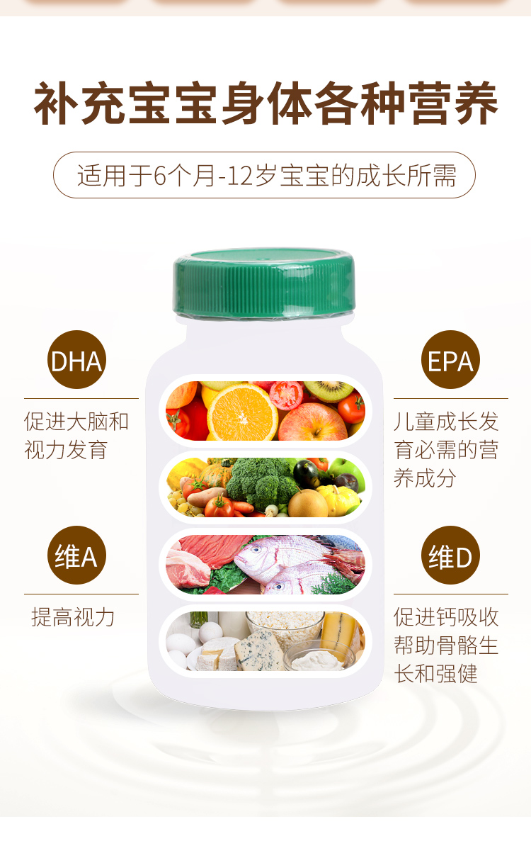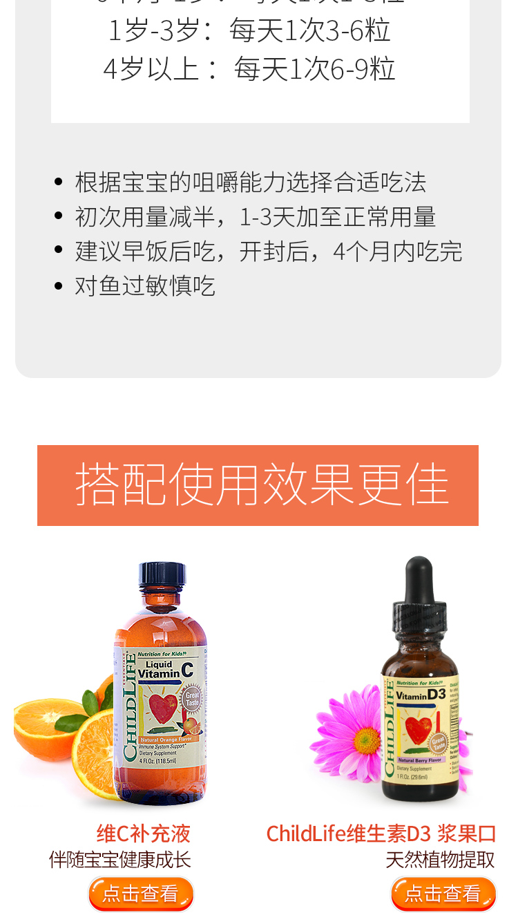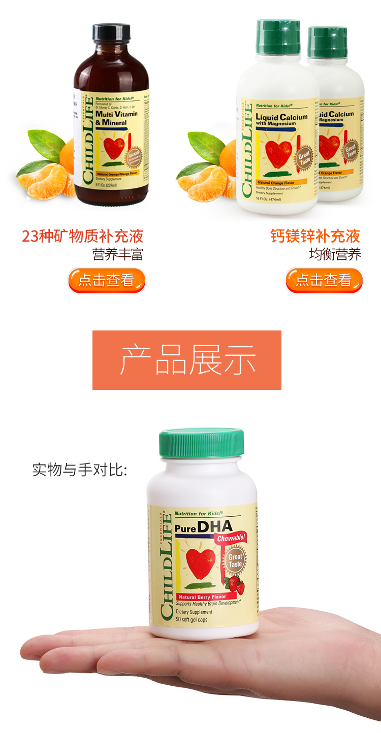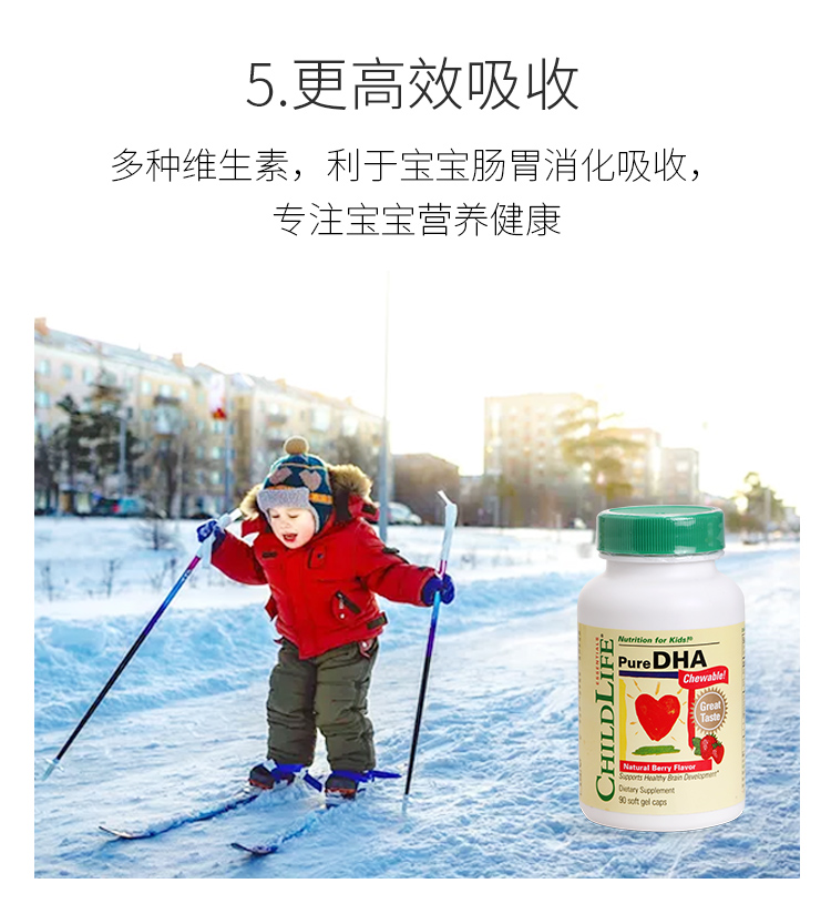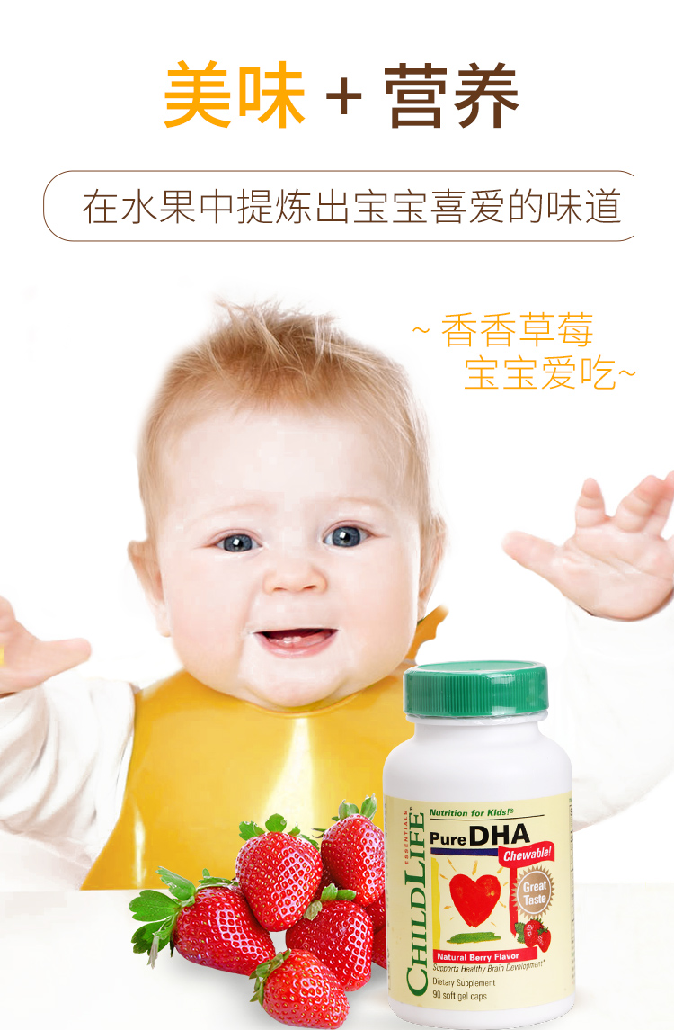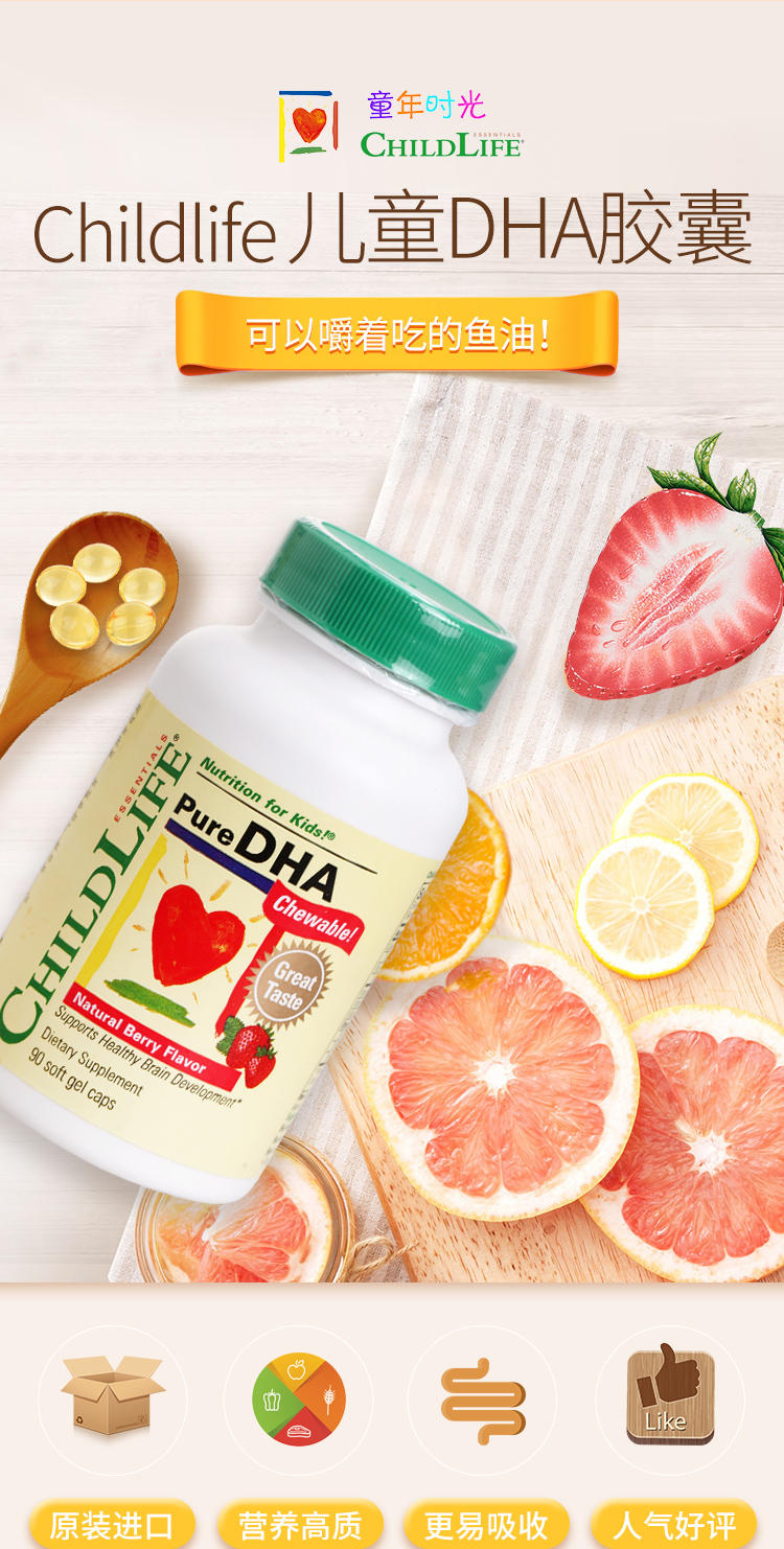 【产品介绍】童年时光childlife是美国婴幼儿营养品领军者,是美国著名的儿科医生创立的婴幼儿营养品牌。CHILDLIFE专业致力于儿童天然营养品的开发生产,取材于最优质的天然有机物,不含任何添加剂及香精。ChildLife纯天然浆果味DHA咀嚼胶囊为宝宝提供有助于大脑及视网膜发育必须的重要物质--DHA; 天然浆果口味,没有讨厌的鱼腥味,豌豆大小的美味超软胶囊,可直接口嚼或吞服,增加孩子食用兴趣,更容易让宝宝接受。纯净无污染的DHA:childlife的鱼油来自挪威无污染海域,产品纯净度超过最严格的欧洲医药标准,可给宝宝安心食用;品质稳定:由于鱼油含有多元不饱和脂肪酸,所以很容易被氧化而产生有害的过氧化物,食用氧化变形后的鱼油反而加害健康,以分子蒸馏法确保其纯度及鲜度,并含有稳定的天然抗氧化剂VE、VA和VD,保证食用的最大安全性。