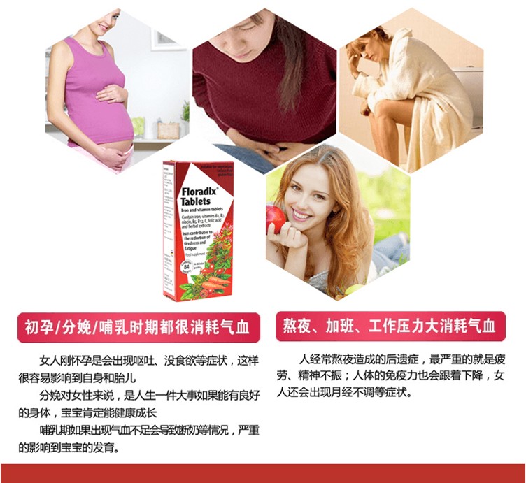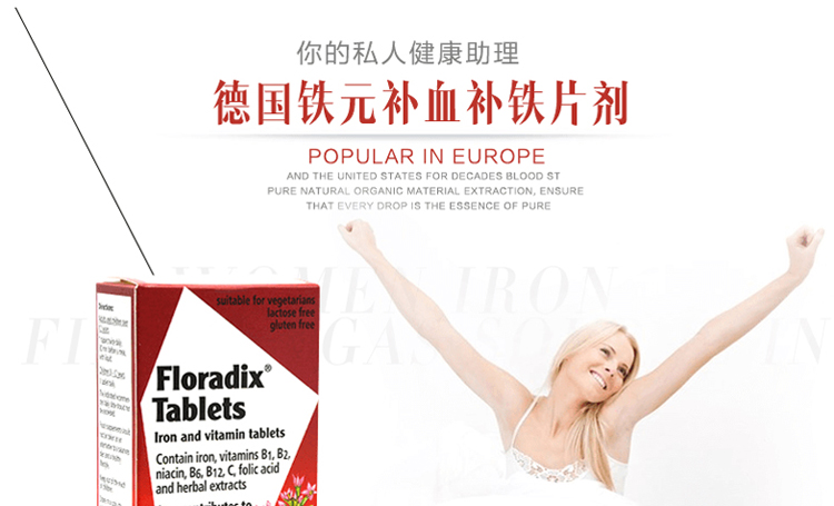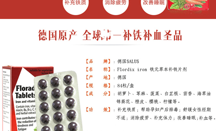 【产品介绍】这款德国Salus Floradix 铁元补铁片剂(女性孕妇补铁补血)有助于打击疲倦和困乏,并恢复健康,充满活力,并让你在生活中焕发活力并充满闪亮;含丰富的铁酵母和草本精华,铁的短缺可以非常迅速导致低血红蛋白含量的红血细胞,这反过来又会造成赋予生命的氧气以组织的供应不足,能够产生血红蛋白,血红蛋白从肺部吸收氧气再途经红血细胞到达整个身体。