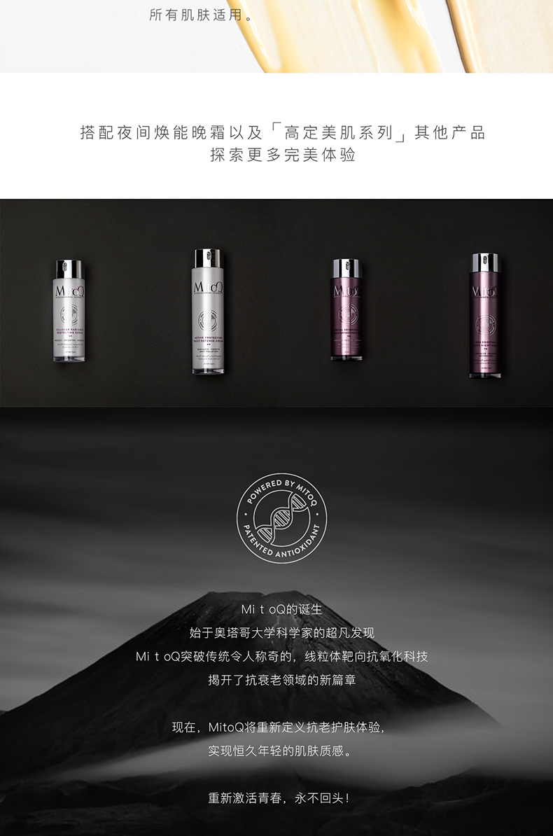 【产品介绍】MitoQ夜间抗糖精华,富含激活线粒体强效抗氧化功能的MitoQ®,超强抗糖化的ProdiziaTM,保护肌肤因糖化而受损的蛋白质结构。提亮肤色的MediatoneTM可减轻色素沉着。维生素C、烟酰胺和玫瑰果等多种顶级成分有效维护胶原蛋白和弹性蛋白,保持肌肤年轻状态。长期使用,肤色将更加均匀、丰满、柔软,肌肤疲倦痕迹明显淡化,看起来更紧致和清新。