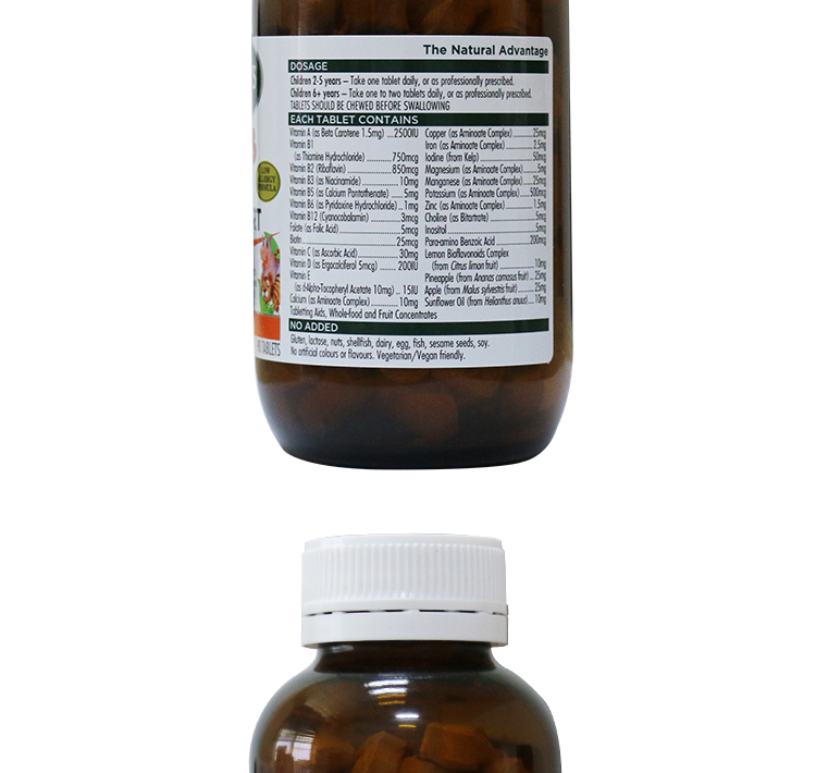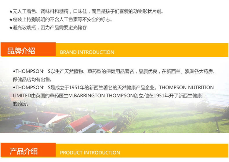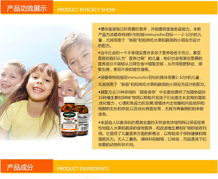 【产品介绍】Thompson's 汤普森 儿童综合维生素免疫片,专为儿童设计,为儿童补充日常所需多种维生素和矿物质,以加强身体免疫能力。当今社会,许多孩子营养吸收不充分。甚至是那些我们认为营养过剩的儿童,他们也会有某些重要的营养成分不能够从日常饮食中摄取 足够,从而导致肥胖症、频繁生病,表现不良和慢性慵倦。