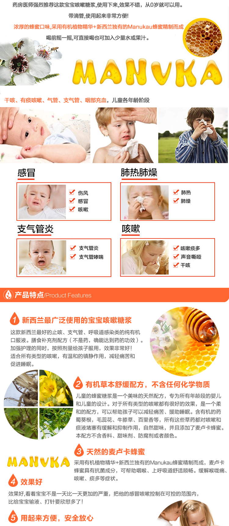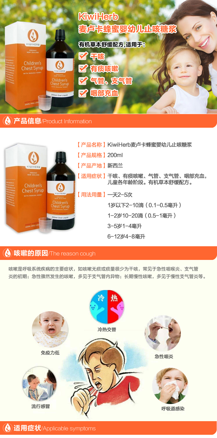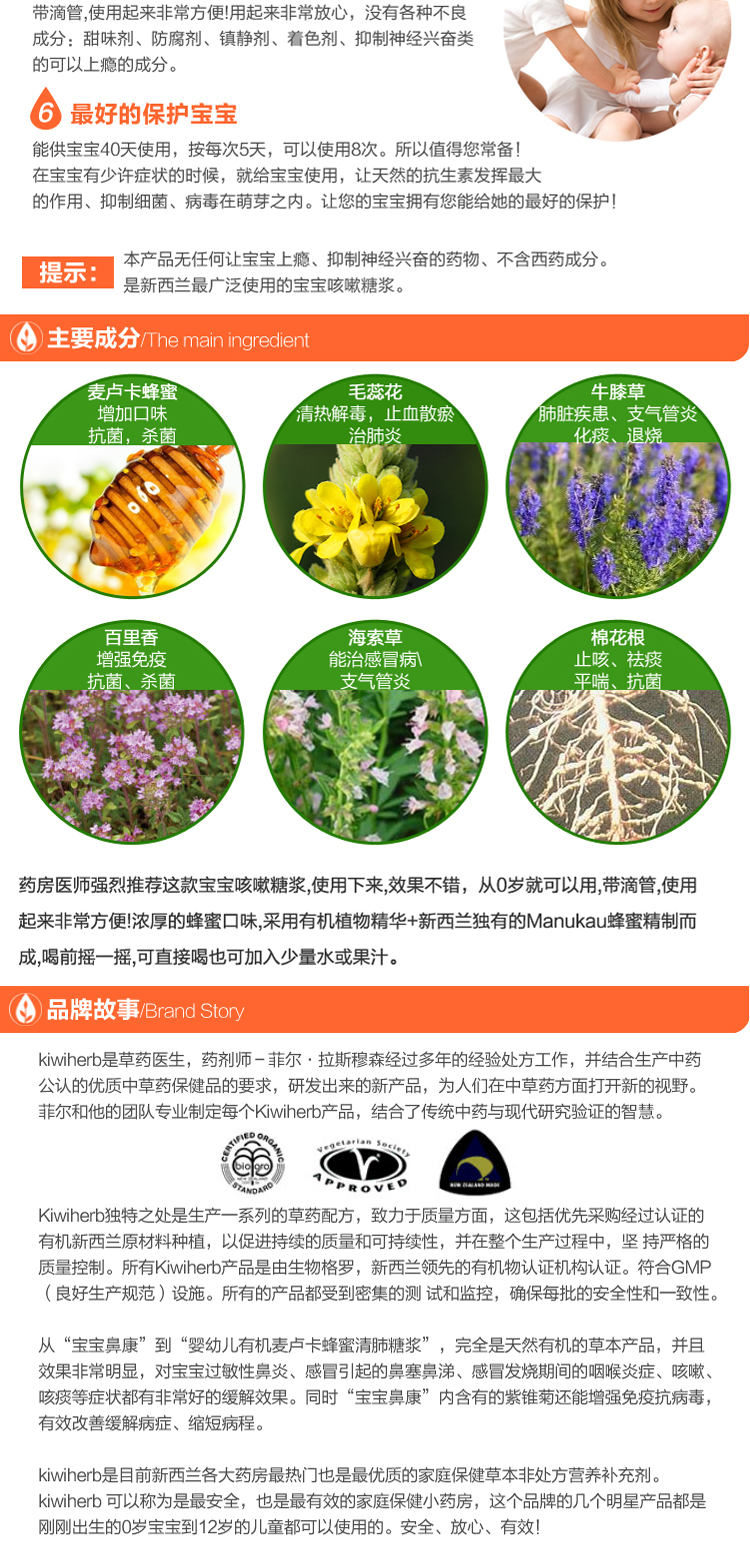 【产品介绍】KiwiHerb 宝宝成人四季止咳糖浆是新西兰最好的止咳、支气管、呼吸道感染类的纯有机口服液。有机草本舒缓配方,不含任何化学物质及不良成分,含有天然的麦卢卡蜂蜜,可帮助咽喉、上呼吸道舒适顺畅,膳食补充剂配方。加强护理的同时,按照剂量给孩子服用,效果非常好!适合所有类型的咳嗽,有温和的镇静作用,减轻痛苦和促进睡眠。带滴管,使用起来非常方便。