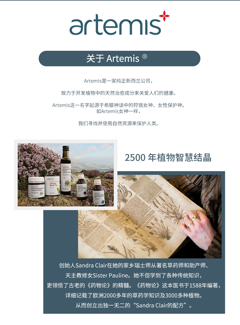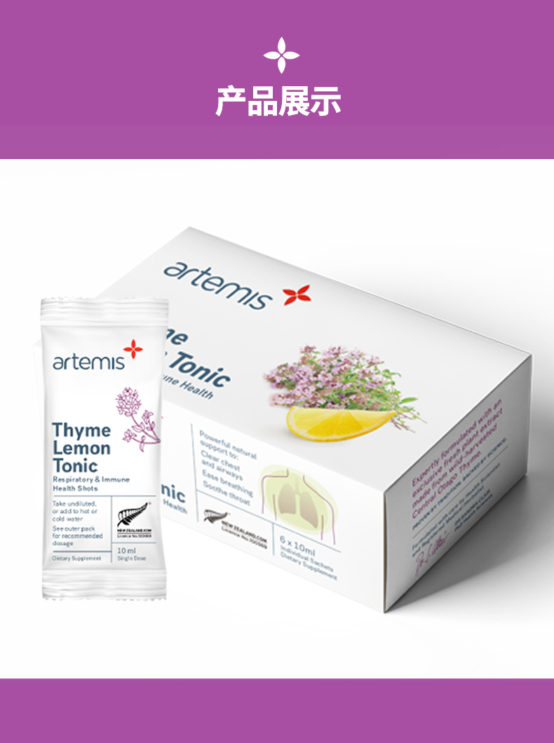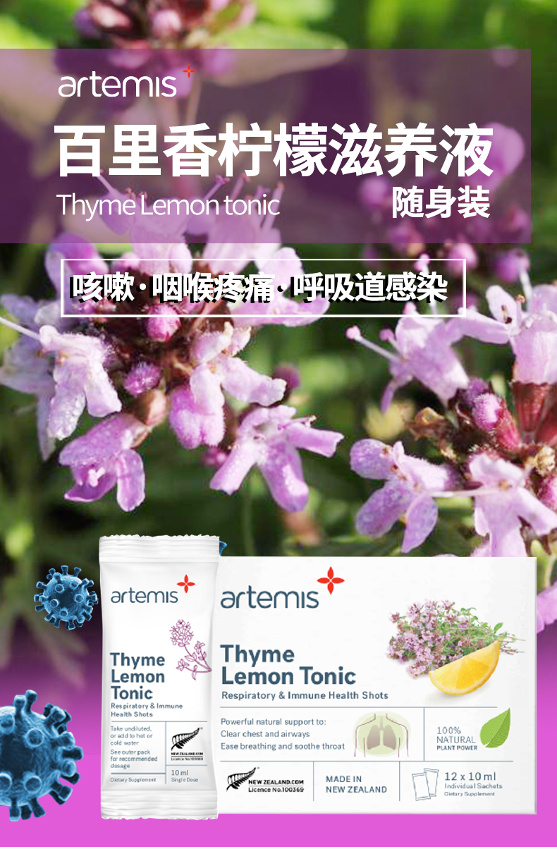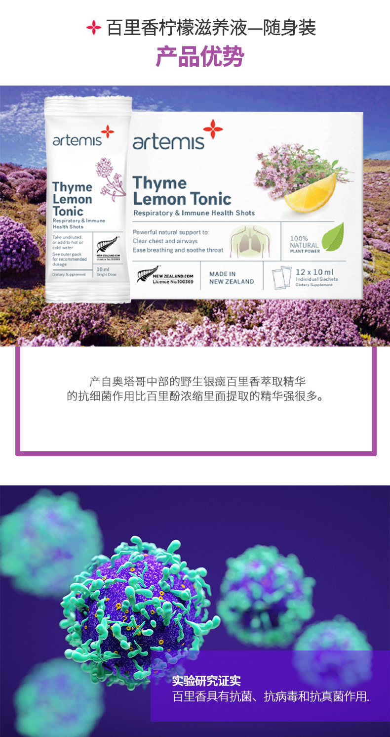 【产品介绍】Artemis 百里香柠檬滋养液便携装 12*10ml,它的主要成分为天然野生百里香和有机柠檬。野生百里香具有帮助预防或治疗病毒性感冒,祛痰、清肺、润喉、增强免疫力的功效,有效预防和缓解由雾霾、空气污染、抽烟引起的各类呼吸系统不适,对百日咳、支气管炎及哮喘患者亦有帮助。其中的百里香产于世界上最纯净的新西兰奥塔哥中部地区,一年只能采摘一次,并在采摘后24小时内加工成原液。产品非常安全有效,孕妇婴儿都可以服用。
