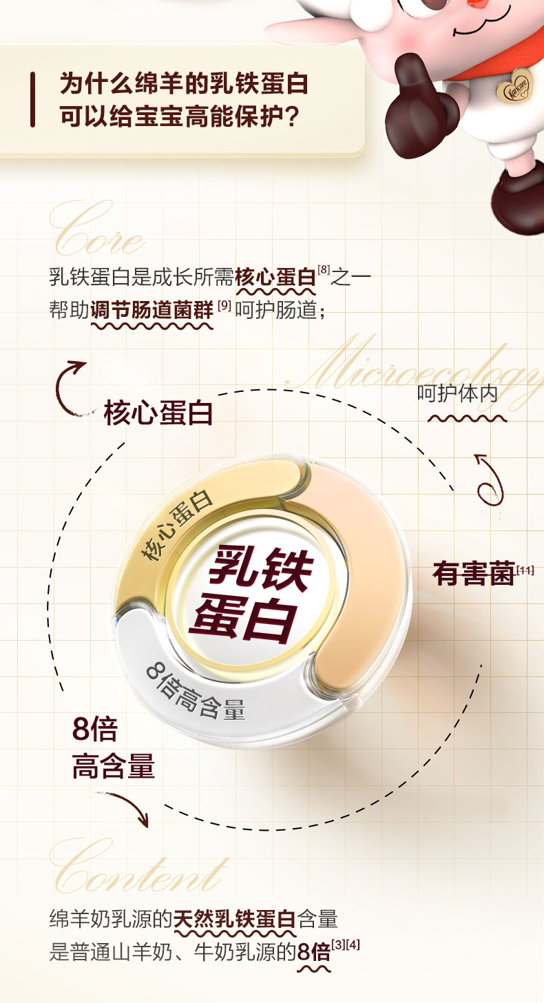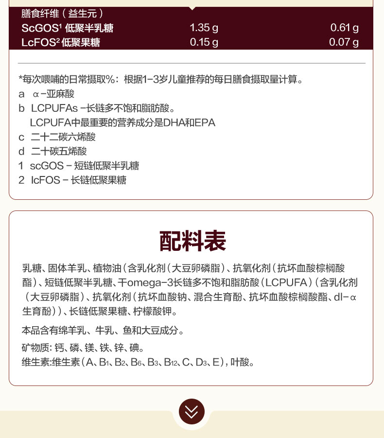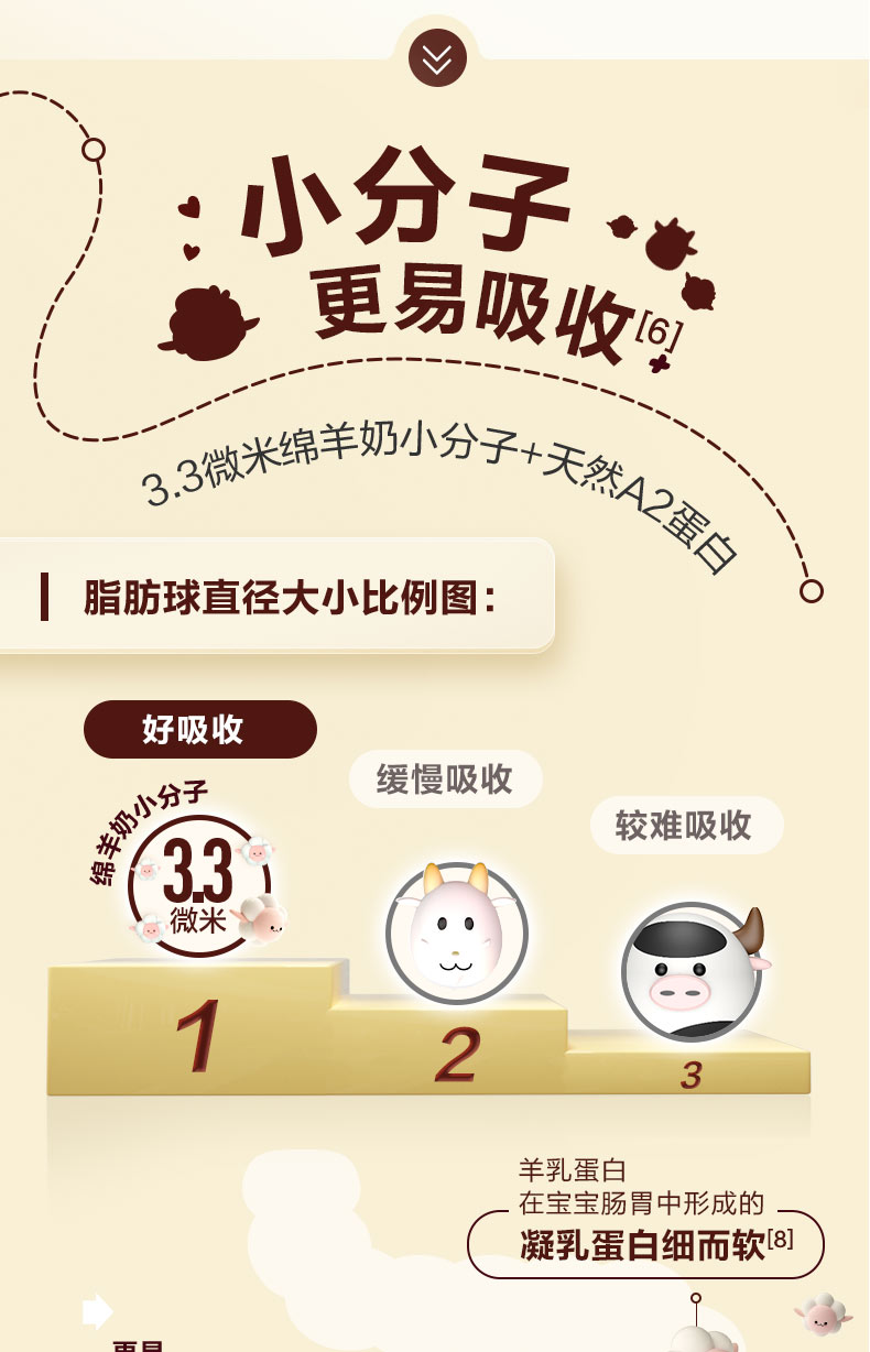 【产品介绍】可瑞康羊奶粉 三段,更营养。羊奶的脂肪球是牛奶的三分之一,更利于人体吸收。富含亚油酸,亚麻酸可转化为宝宝大脑发育的DHA和AA,配比均衡。可瑞康羊奶优势:进口好羊奶!百年可瑞康。羊奶配方,含有智因子,DHA,ARA,胆碱,叶黄素等营养元素的含量。源自新西兰天然牧场,为宝宝提供充足营养。