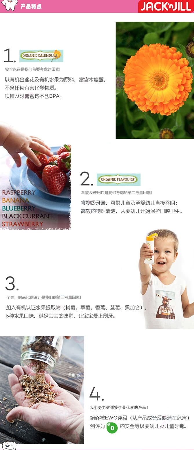 世界上真正安全可食的宝宝牙膏,jake n' jill是1949年在澳洲墨尔本成立的家族公司,专门生产儿童牙膏,照片上的是现在年轻的老板夫妻俩,因为自己有宝宝,所以两人更加致力于发明更安全,更可靠,宝宝安全使用的安全牙膏,因为在牙膏行业多年,知道很多大品牌的儿童牙膏里面都含有化学元素,而宝宝有时喜欢吞食牙膏,这样怎么可以,因为老公是药剂师,所以他们开始研制天然的,宝宝可以吞服,还防蛀的天然牙膏,牙膏主要是玉米淀粉制成,不含双酚A,无氟,不含防腐剂,不含化学添加剂!现在jake n' jill已经畅销世界,成为许多妈妈的首选哦!