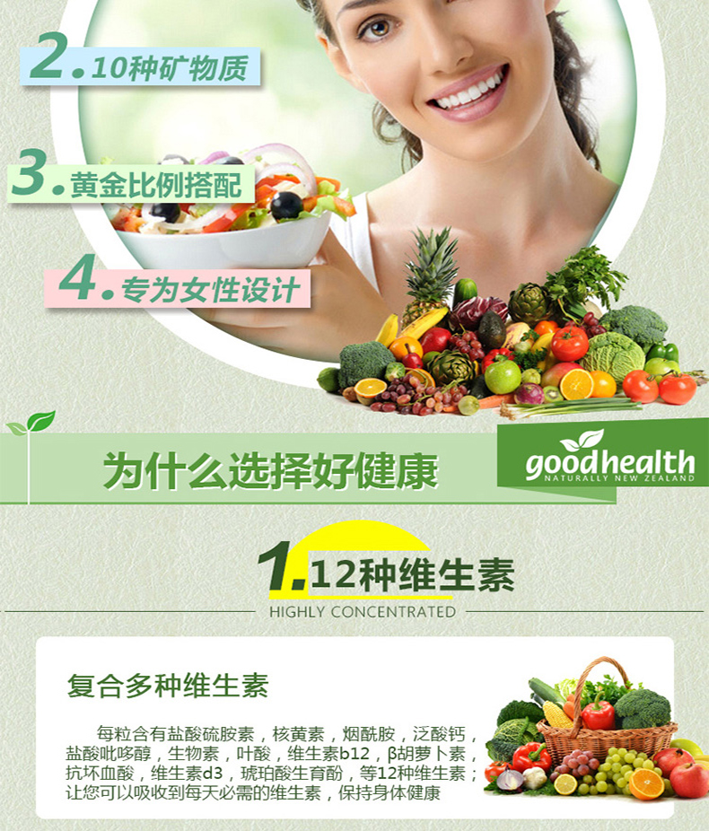【产品介绍】Good Health 好健康女性综合维生素具有独特的综合配方,其中的维生素和矿物质等成分全部为纯天然植物提取,萃取自新西兰纯净无污染环境生长的特殊药草,包括月见草、覆盆子叶、金丝桃草等,特别为女性需要设计。此产品应是完美的女性保健品,特别是对于那些工作在高压力环境下的人或运动员,以及维生素和矿物质的缺乏引起的疲乏和坐立不安。含有月见草油和药草,能缓解神经紧张,并对女性生殖系统有益。
