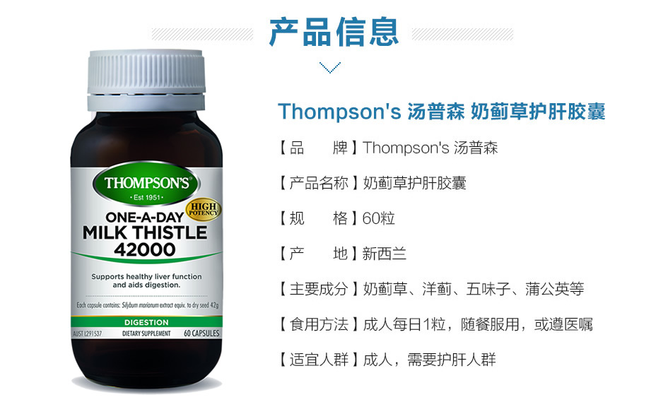 Thompsons Milk Thistle 42000 60C#Thompson’s#汤普森#解酒#护肝#排毒#Thompsons 汤普森奶蓟草护肝片 60粒
