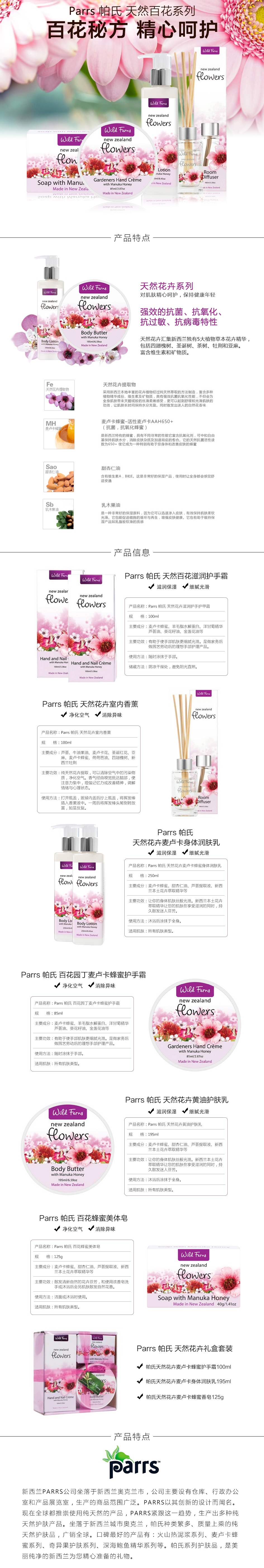 【产品介绍】Parrs 帕氏天然花卉香皂富含麦卢卡蜂蜜和新西兰天然花卉提取物,柔和地清洁皮肤,质地柔软香气宜人,经过三次研磨制造的高质量豪华香皂,使用后肌肤会散发出自然花香味带给您美妙的体验。适用于任何肤质。