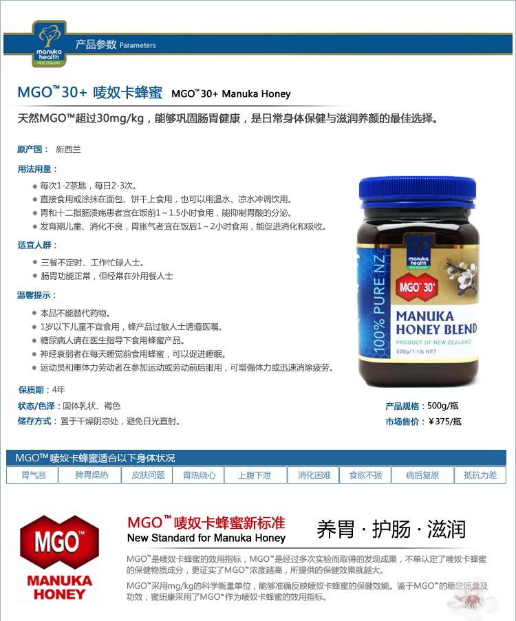 Manuka Health 蜜纽康麦卢卡蜂蜜 MGO30+ 500g