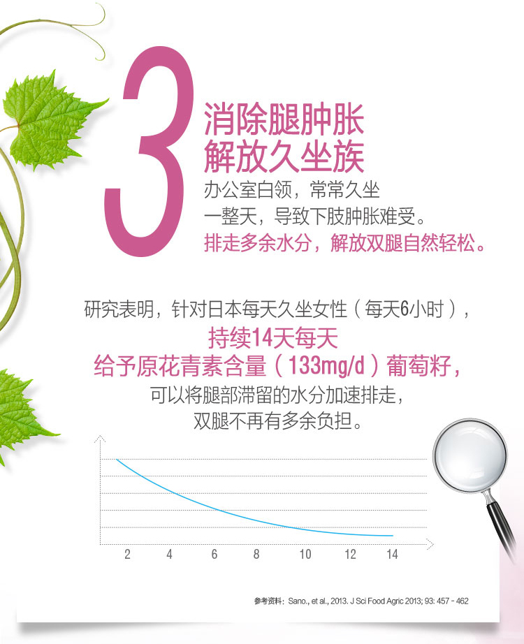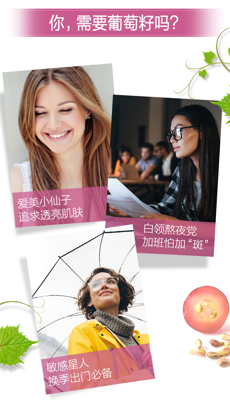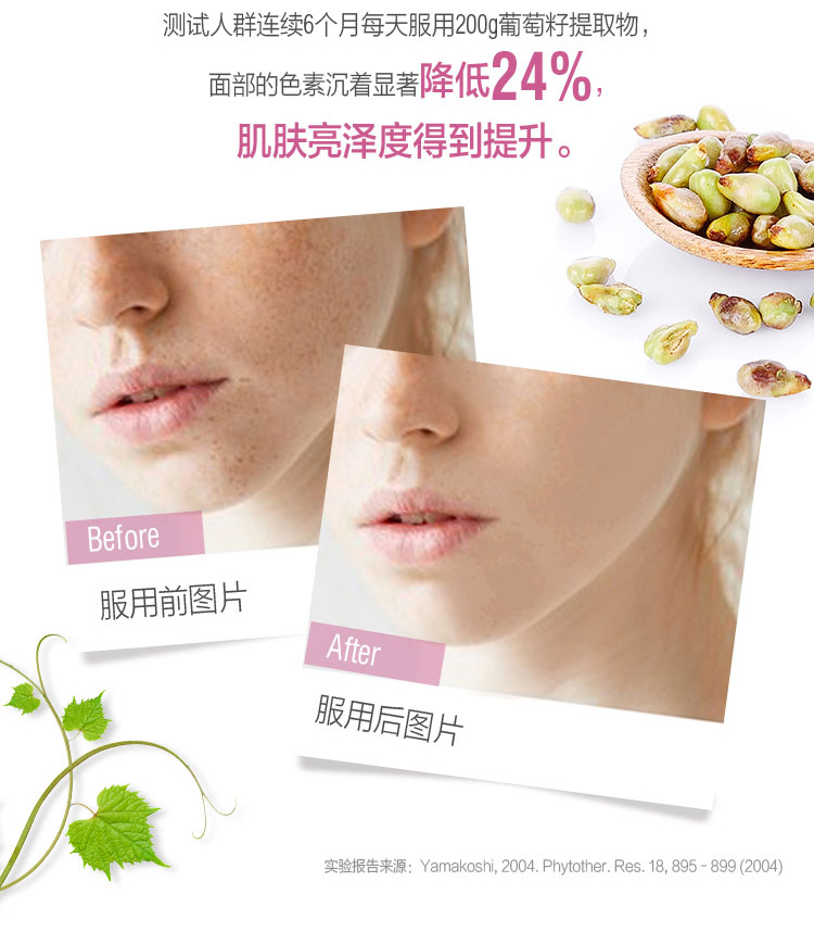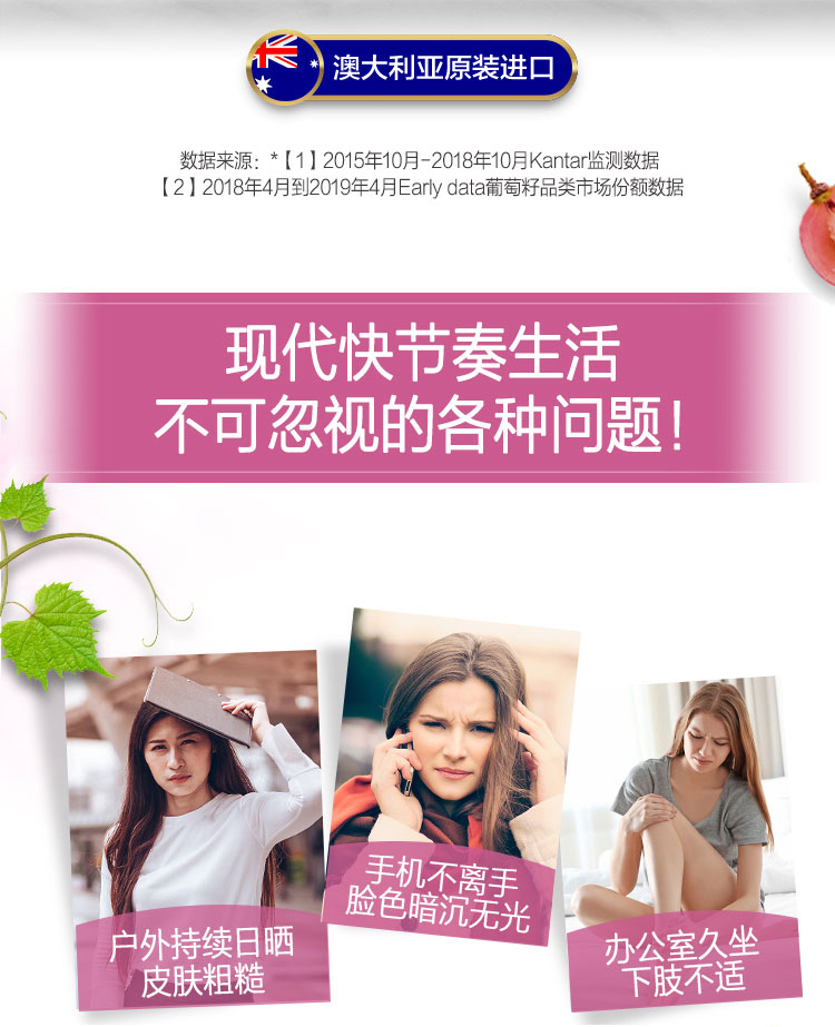 【产品介绍】Swisse 澳洲葡萄籽精华天然抗氧化,富含维生素C和血橙,有利于皮肤健康以及胶原蛋白产生;维生素C有助于结缔组织的形成和支持小伤口的愈合过程;葡萄籽和维生素C帮助的抗氧化性能防止自由基损伤。葡萄籽中含有高浓度的原花青素,一种天然生物类黄酮,也存在于水果和蔬菜。葡萄籽还有助于减轻肿胀(水肿),沉重感,疼痛和腿部的瘙痒;胶原蛋白是一种主要的结构蛋白,强有力的结缔组织,帮助保持皮肤的完整性和外观重要。