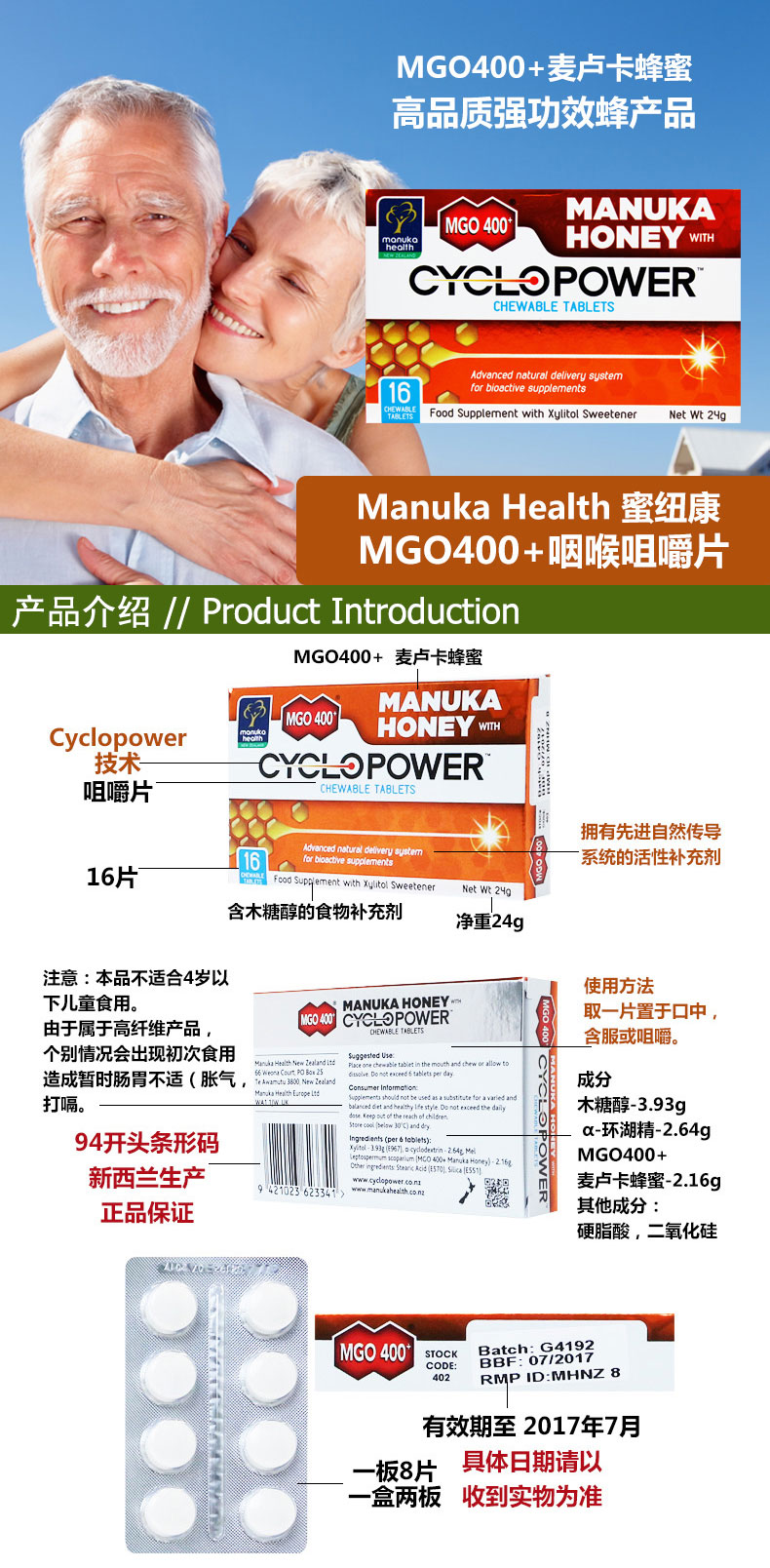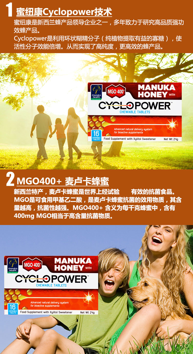 Manuka Health 蜜纽康MGO400+麦卢卡蜂蜜环节技术口腔咽喉咀嚼片16片