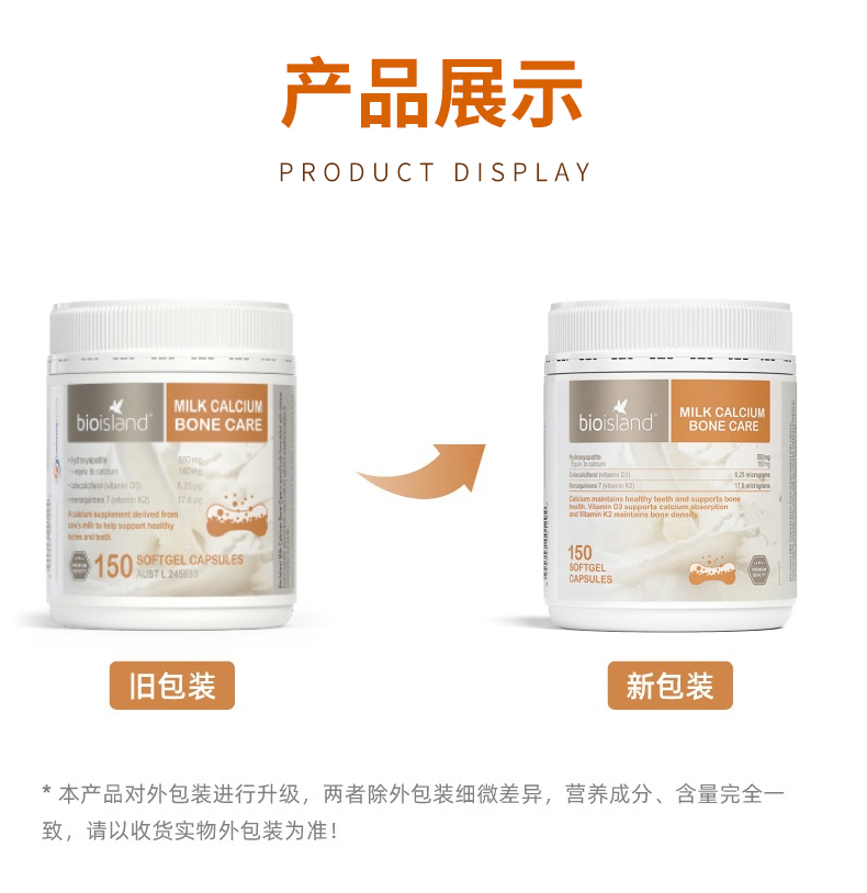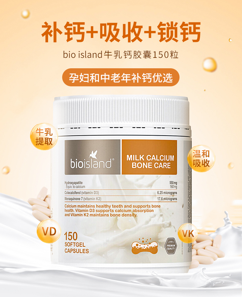 【产品介绍】Bioisland天然液体牛乳钙骨健康胶囊配方中强大黄金搭档组合(乳钙+维D+维K),将补钙、吸收、锁钙同步完成。澳洲BIO ISLAND 天然牛乳钙骨保健胶囊中的钙质来源于新西兰纯净的牛乳中提取的天然牛乳钙,可有效的被人体吸收。钙是骨骼发育和维持骨骼、牙齿、肌肉的收缩和神经传递的重要矿物质,在生命的各个阶段都需要钙的补充都尤为重要。在青春期,怀孕期间和哺乳期,妇女绝经后,中老年阶段,需要最大限度地保持稳定的摄入和吸收钙质提高骨骼结构的强度。同时,含有的维生素D3能提高促进体内钙的吸收,有效减少因饮食中缺乏钙及钙不能有效吸收所导致骨质疏松。每粒胶囊含有维生素K2将补充和吸收的钙质与人体骨骼中本身含有的钙充分结合提高骨密度,强大支持锁住补充的钙质,避免钙质的流失。