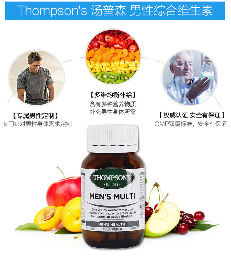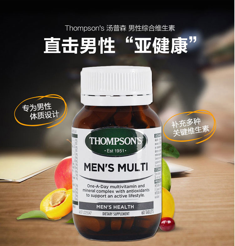 【产品介绍】Thompson 汤普森男士复合维生素,专为男性所需营养特殊设计,全方位蕴含多种男性所需的营养素,充分给于必需的关怀,最大的特点是尤其含有多种消化酶,帮助吸收消化。还富含维生素和矿物质,特别添加锌、硒及人参,帮助减少疲劳缓解压力,提高能量输出帮助维持男士出色的表现,帮助肝脏解毒促进身体免疫系统全面健康,防护多种疾病,帮助抵御自由基的侵害,使男士精力充沛每一天。使男生精力充沛,帮助全身的血液循环,还可以调节体内新陈代谢。缓解疲劳和压力,提高抵抗力。助维持男士出色的表现,帮助肝脏解毒促进身体免疫系统全面健康,防护多种疾病。帮助抵御自由基的侵害。