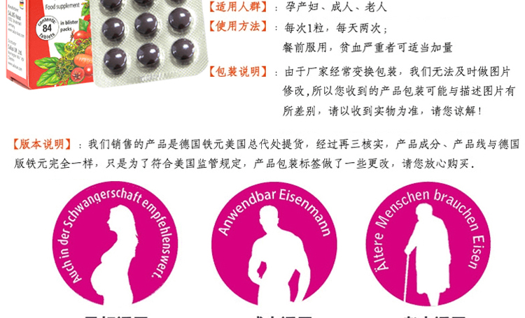 【产品介绍】这款德国Salus Floradix 铁元补铁片剂(女性孕妇补铁补血)有助于打击疲倦和困乏,并恢复健康,充满活力,并让你在生活中焕发活力并充满闪亮;含丰富的铁酵母和草本精华,铁的短缺可以非常迅速导致低血红蛋白含量的红血细胞,这反过来又会造成赋予生命的氧气以组织的供应不足,能够产生血红蛋白,血红蛋白从肺部吸收氧气再途经红血细胞到达整个身体。