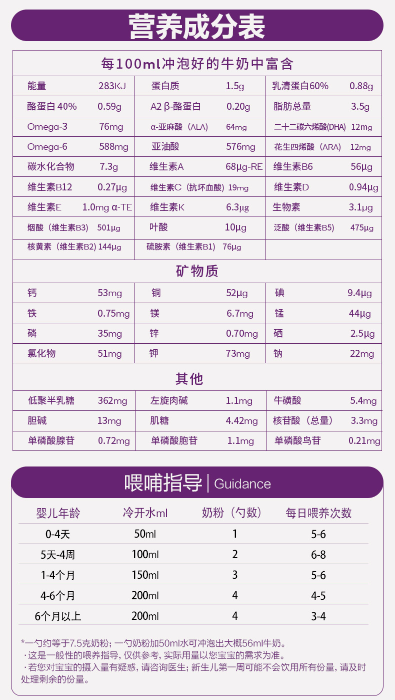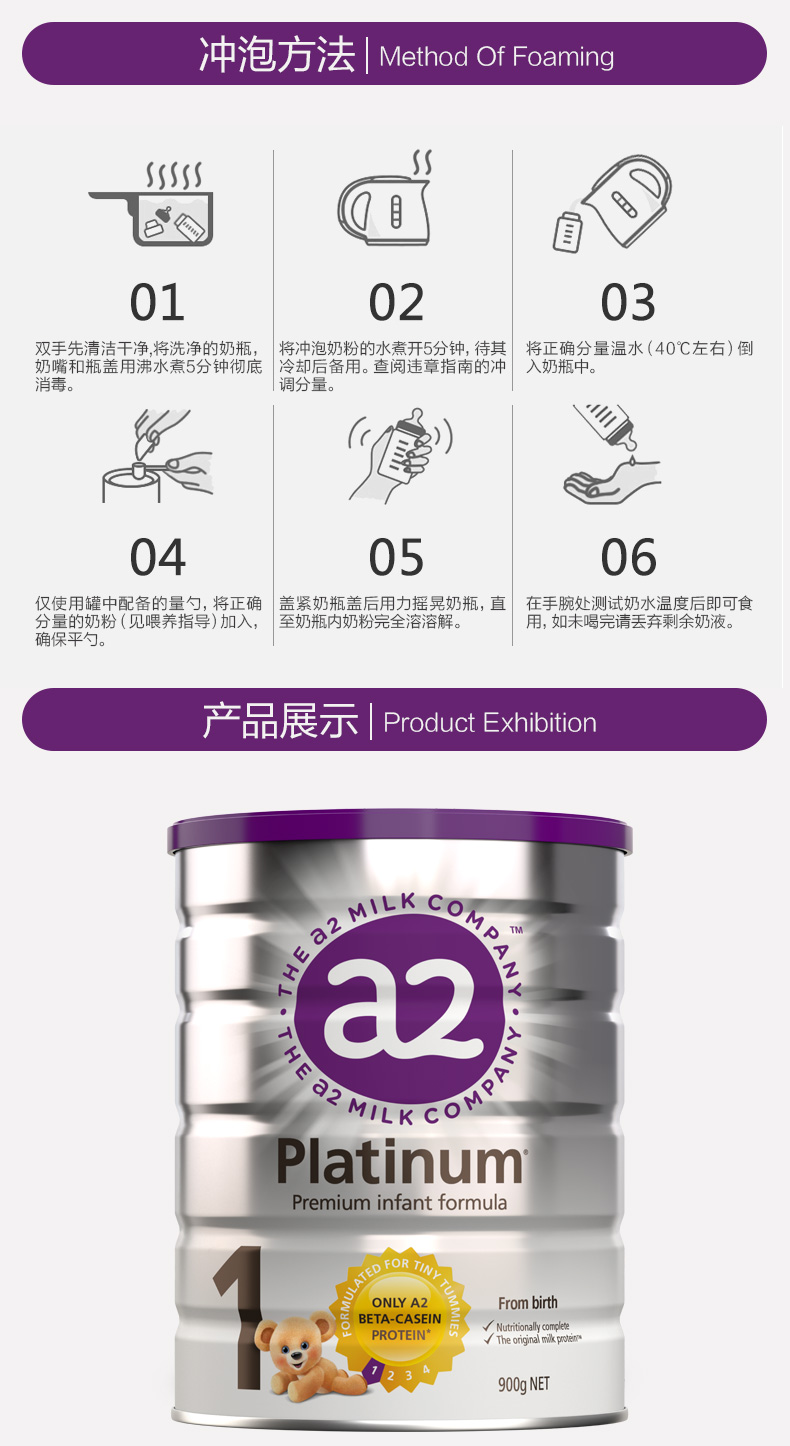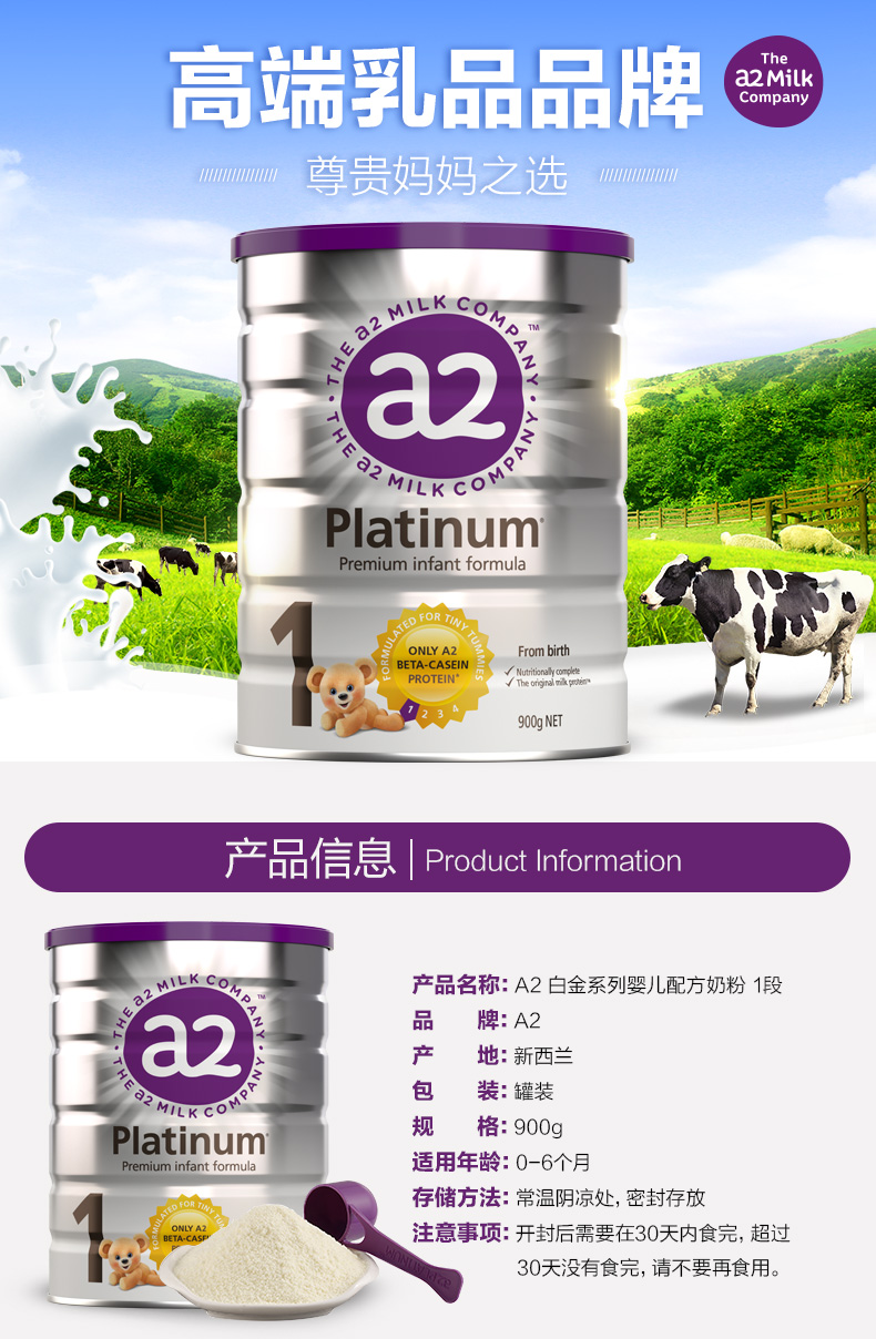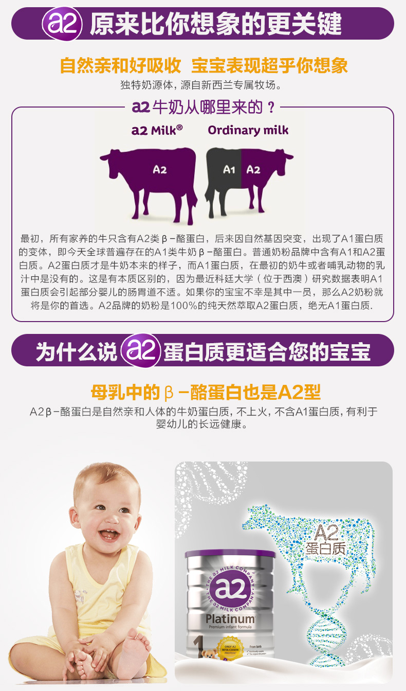 a2®白金™奶粉,源自基因纯正的新西兰特选A2奶牛。目前,(西方的奶牛中)只有30%的奶牛产生A2酪蛋白,A2酪蛋白珍稀独特,是蛋白质的天然原型,母乳中的β-酪蛋白也是A2型,因此,a2白金奶粉最接近母乳。有助于宝宝的消化吸收及长远的健康。优质奶源地+A2奶源体,打造a2白金奶源新标准!百分之百严格按照新西兰食品安全标准生产及包装,由Asure质量检测中心(百分之百由新西兰政府控制)进行独立的质量检测,因此才能确保每一罐a2®白金™奶粉都只含有A2 β-酪蛋白。