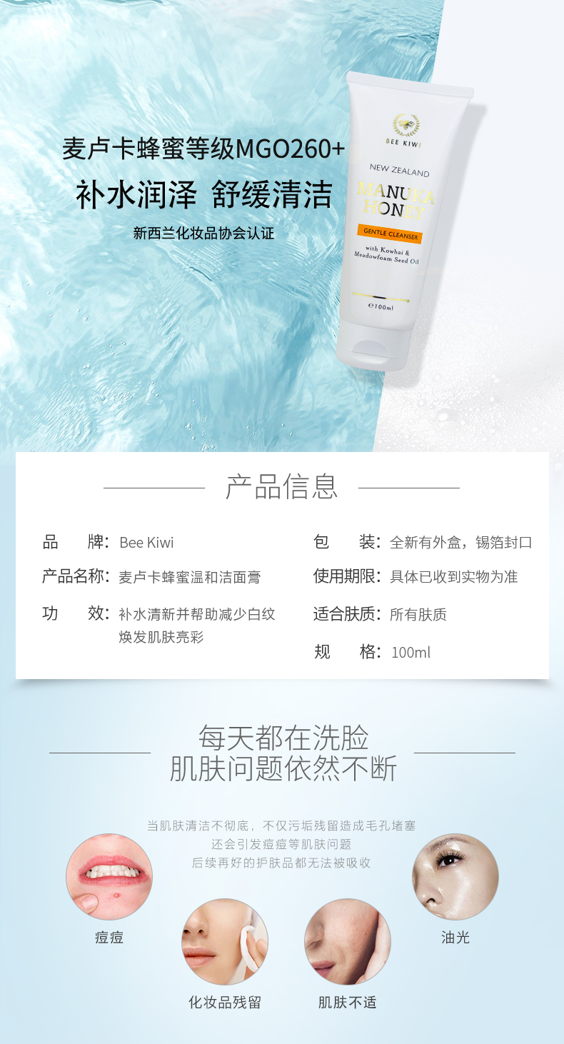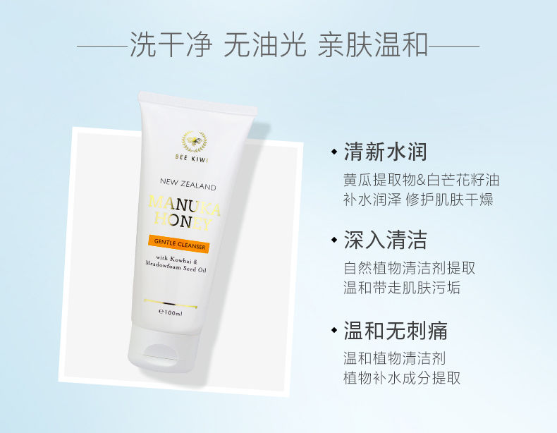 【产品介绍】Nature's Beauty自然美Bee kiwi 碧卡维麦卢卡蜂蜜洁面乳100ml,深层清洁肌肤表皮层,构筑天然保护,保湿清新,深入清洁,温和低刺激!蜂蜜能量,助理舒缓清洁!肌肤轻松美起来~