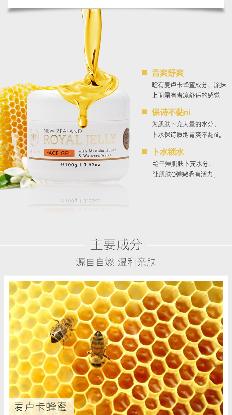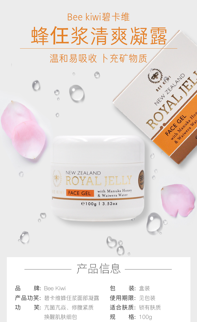 新西兰Nature's Beauty自然美Bee kiwi碧卡维 蜂王浆面部清爽保湿凝露100g#新西兰Nature's Beauty自然美Bee kiwi碧卡维 蜂王浆面部清爽保湿凝露100g