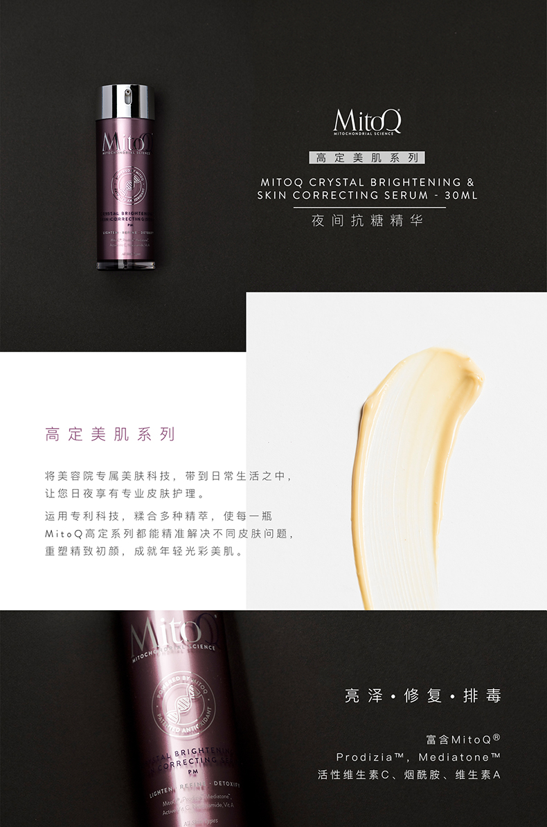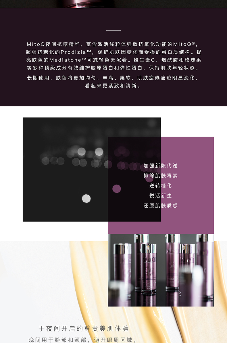 【产品介绍】MitoQ夜间抗糖精华,富含激活线粒体强效抗氧化功能的MitoQ®,超强抗糖化的ProdiziaTM,保护肌肤因糖化而受损的蛋白质结构。提亮肤色的MediatoneTM可减轻色素沉着。维生素C、烟酰胺和玫瑰果等多种顶级成分有效维护胶原蛋白和弹性蛋白,保持肌肤年轻状态。长期使用,肤色将更加均匀、丰满、柔软,肌肤疲倦痕迹明显淡化,看起来更紧致和清新。
