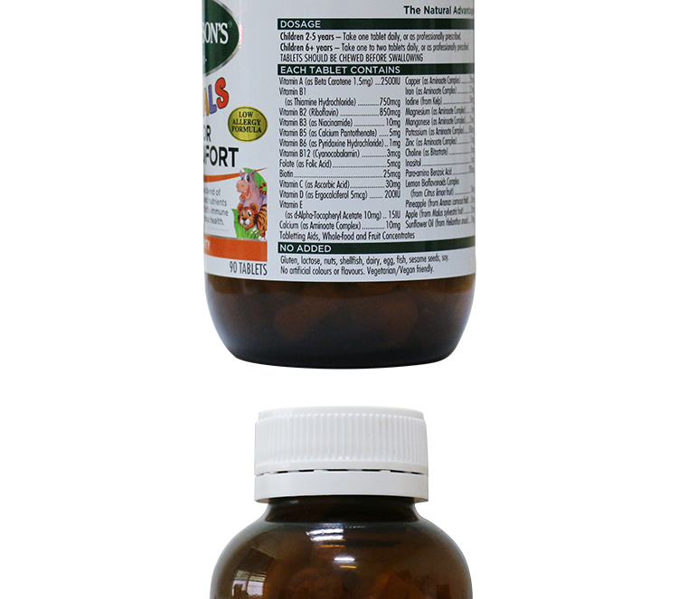 【产品介绍】Thompson's 汤普森 儿童综合维生素免疫片,专为儿童设计,为儿童补充日常所需多种维生素和矿物质,以加强身体免疫能力。当今社会,许多孩子营养吸收不充分。甚至是那些我们认为营养过剩的儿童,他们也会有某些重要的营养成分不能够从日常饮食中摄取 足够,从而导致肥胖症、频繁生病,表现不良和慢性慵倦。