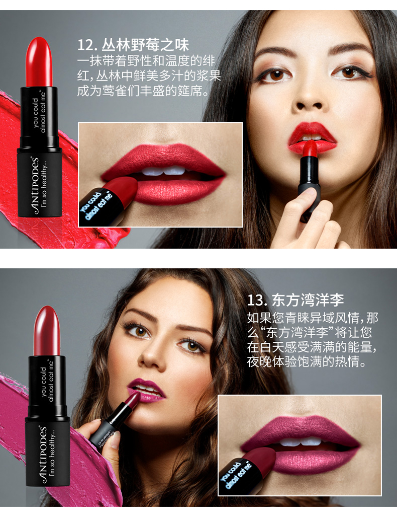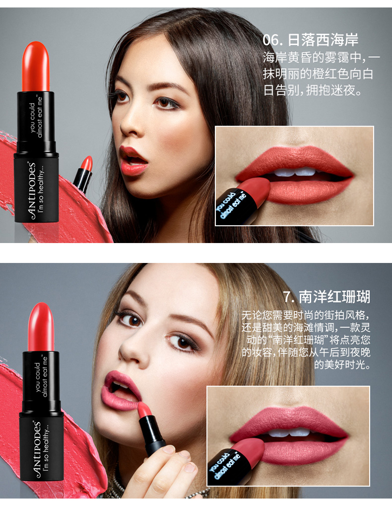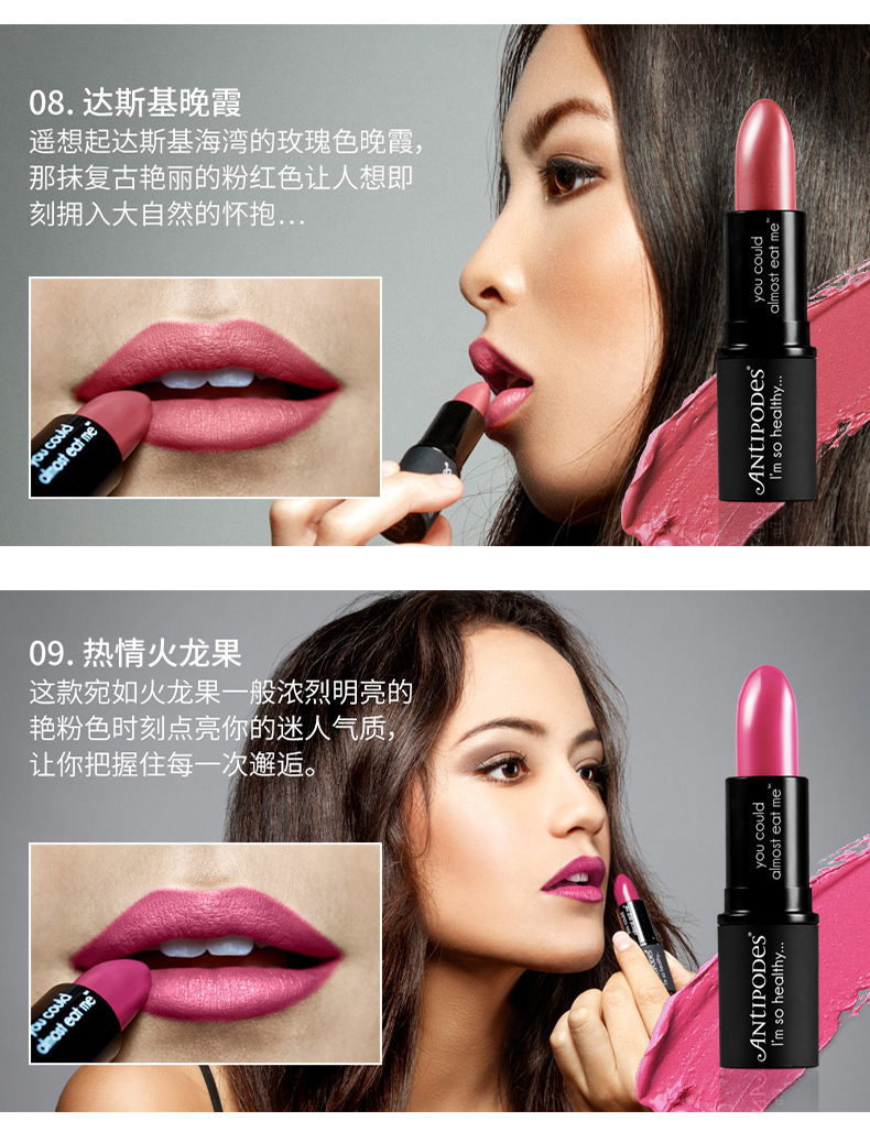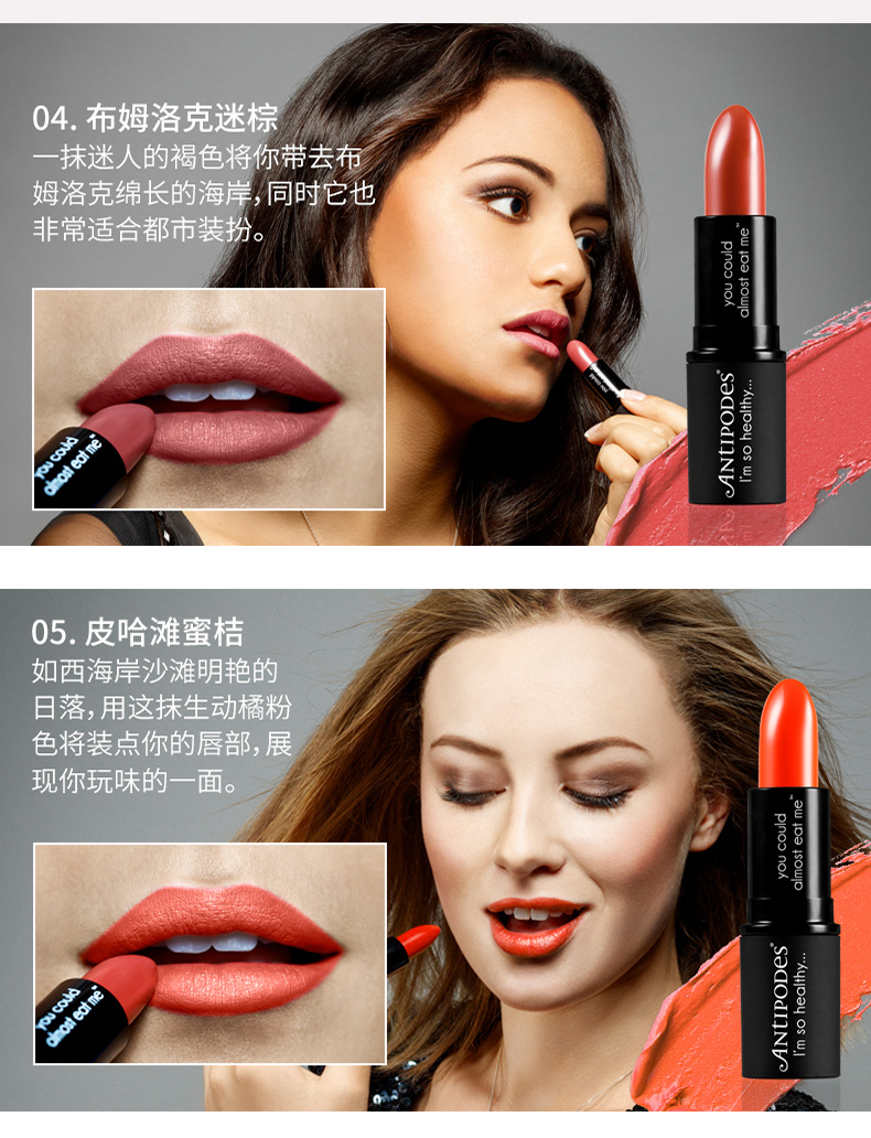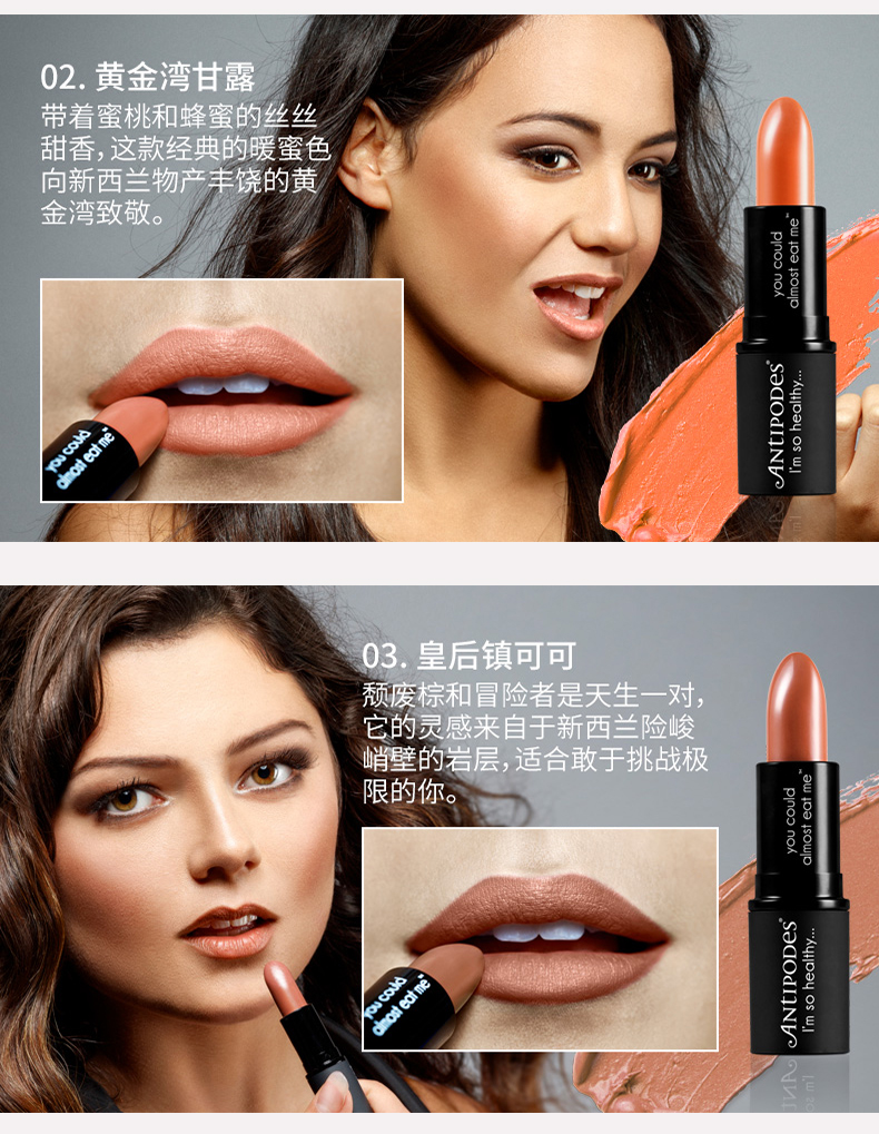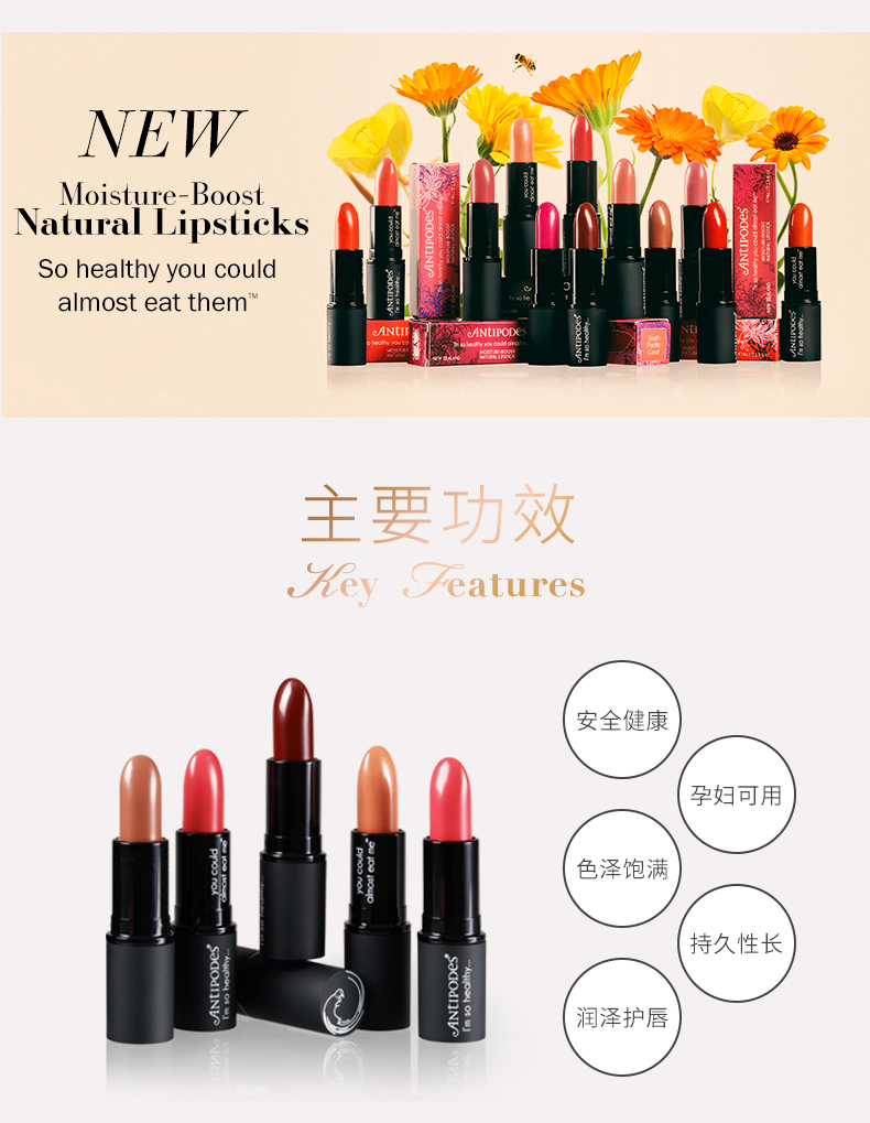 【产品介绍】Antipodes 天然有机保湿口红,成分天然有机,质地温和细腻幼滑,让孕妈咪及哺乳妈咪放心使用。不添加防腐剂,人工色素,香料,滑石粉等有害物质。有助于抚平唇纹,持久呵护双唇,让双唇柔软光泽;其独特的保湿配方,能够瞬间提升水润度。大限度锁住双唇水份,让双唇颜色靓丽持久。深受各个年龄层女性青睐和追捧。