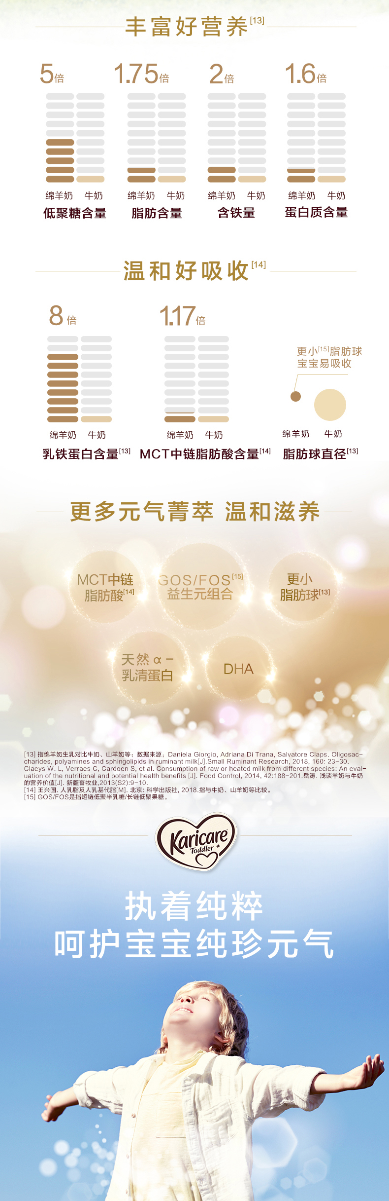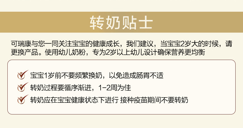 【产品介绍】可瑞康羊奶粉 二段,更营养。羊奶的脂肪球是牛奶的三分之一,更利于人体吸收。富含亚油酸,亚麻酸可转化为宝宝大脑发育的DHA和AA,配比均衡。可瑞康羊奶优势:进口好羊奶!百年可瑞康。羊奶配方,含有智因子,DHA,ARA,胆碱,叶黄素等营养元素的含量。源自新西兰天然牧场,为宝宝提供充足营养。
