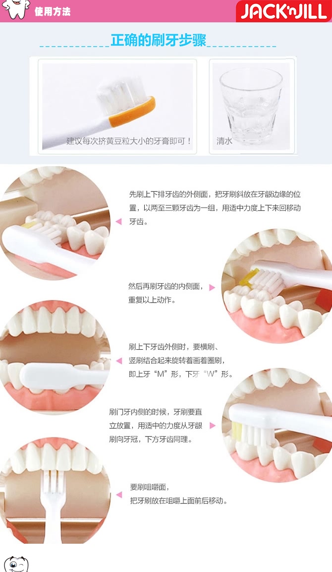 --孩子到1岁之后,乳牙萌出多了,就要购买婴幼儿使用的小牙刷,每天晚上入睡之前,给孩子刷一次牙,每一颗牙的每一个牙面都要刷到。