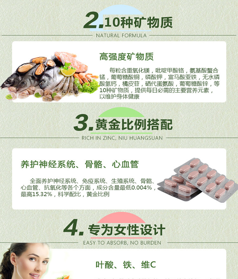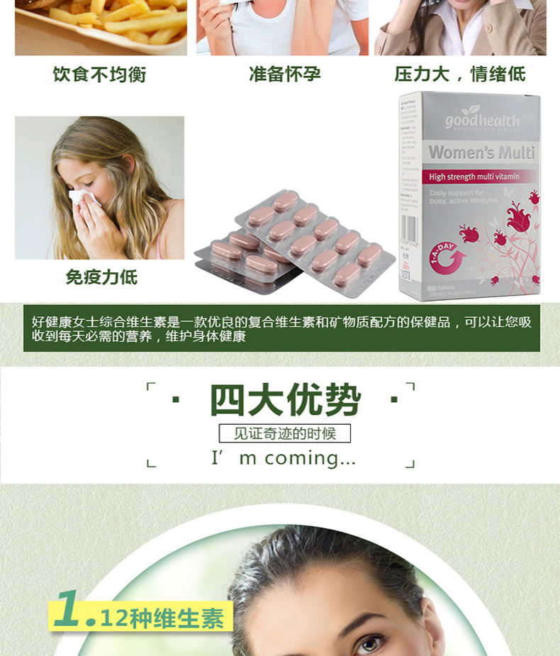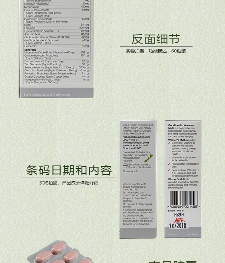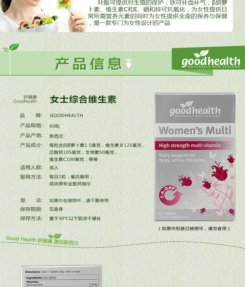 【产品介绍】Good Health 好健康女性综合维生素具有独特的综合配方,其中的维生素和矿物质等成分全部为纯天然植物提取,萃取自新西兰纯净无污染环境生长的特殊药草,包括月见草、覆盆子叶、金丝桃草等,特别为女性需要设计。此产品应是完美的女性保健品,特别是对于那些工作在高压力环境下的人或运动员,以及维生素和矿物质的缺乏引起的疲乏和坐立不安。含有月见草油和药草,能缓解神经紧张,并对女性生殖系统有益。