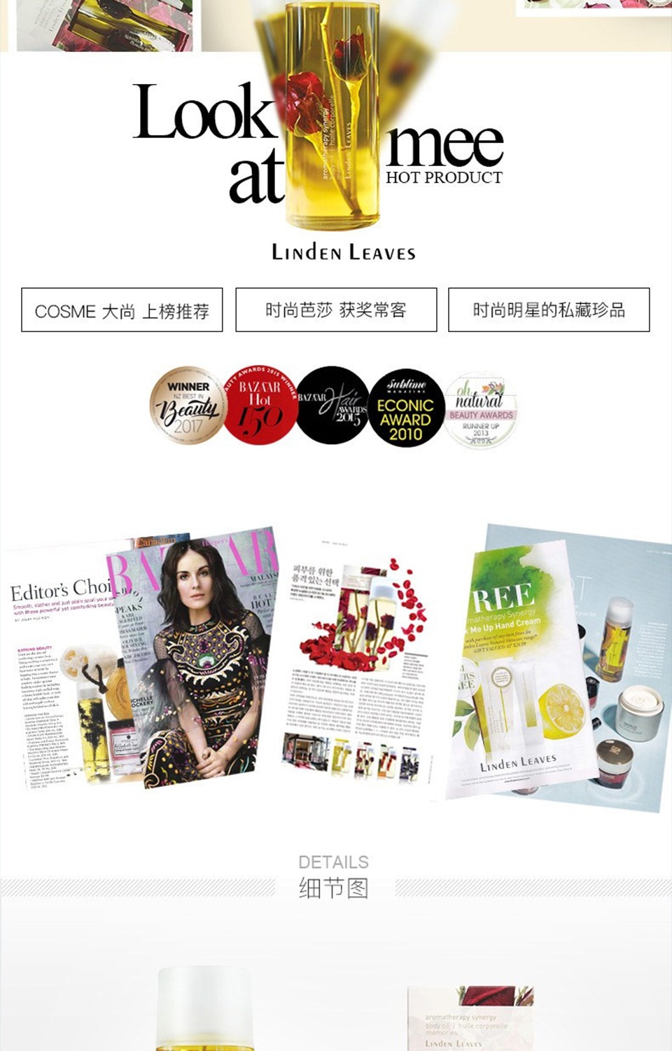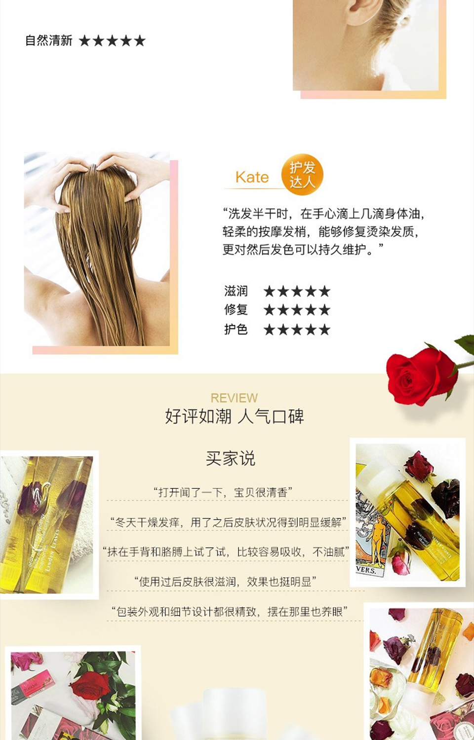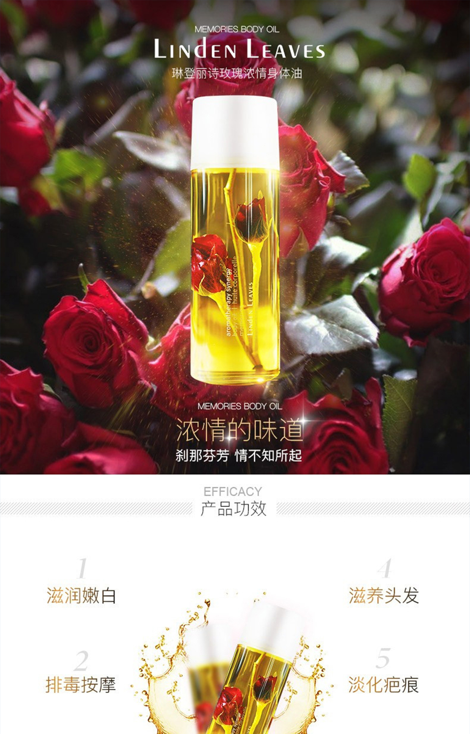 【产品介绍】Linden Leaves 天然美白香体护理精油(玫瑰香型)纯天然植物提取,滋养并保持皮肤柔软和光泽有弹性。混合纯甜杏仁和杏仁油,有机玫瑰果和鳄梨油,富含维生素E和注入融合了奢华的玫瑰,天竺葵和依兰,及保持皮肤柔软和滋养。这款美丽的天然油中含有真正的玫瑰。无任何化学添加,有效美白滋养肌肤,芳香清新怡人,沐浴后可做身体润肤之用,也可用于肌肤按摩油,疏通经络,结实消肿去疤,有效修复受损细胞。
