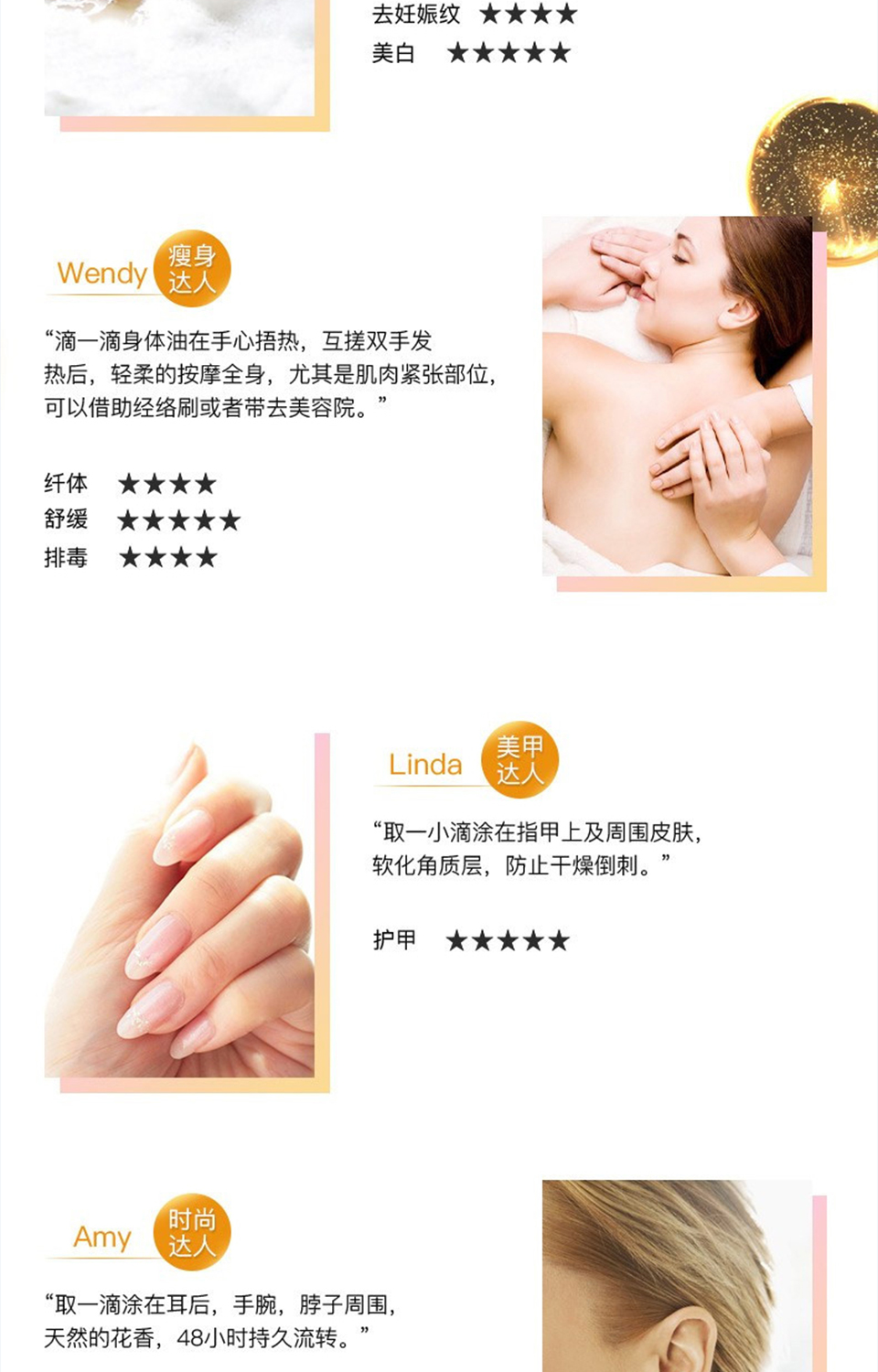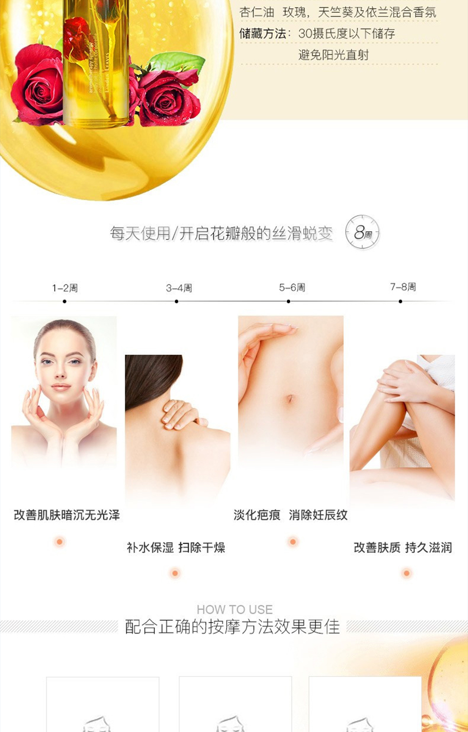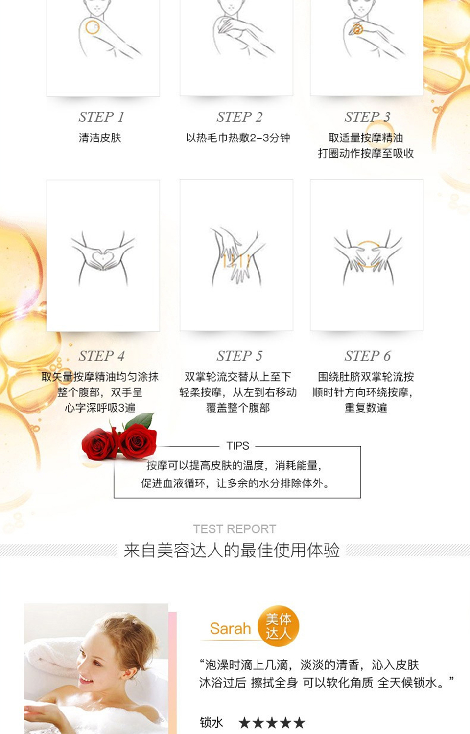 【产品介绍】Linden Leaves 天然美白香体护理精油(玫瑰香型)纯天然植物提取,滋养并保持皮肤柔软和光泽有弹性。混合纯甜杏仁和杏仁油,有机玫瑰果和鳄梨油,富含维生素E和注入融合了奢华的玫瑰,天竺葵和依兰,及保持皮肤柔软和滋养。这款美丽的天然油中含有真正的玫瑰。无任何化学添加,有效美白滋养肌肤,芳香清新怡人,沐浴后可做身体润肤之用,也可用于肌肤按摩油,疏通经络,结实消肿去疤,有效修复受损细胞。