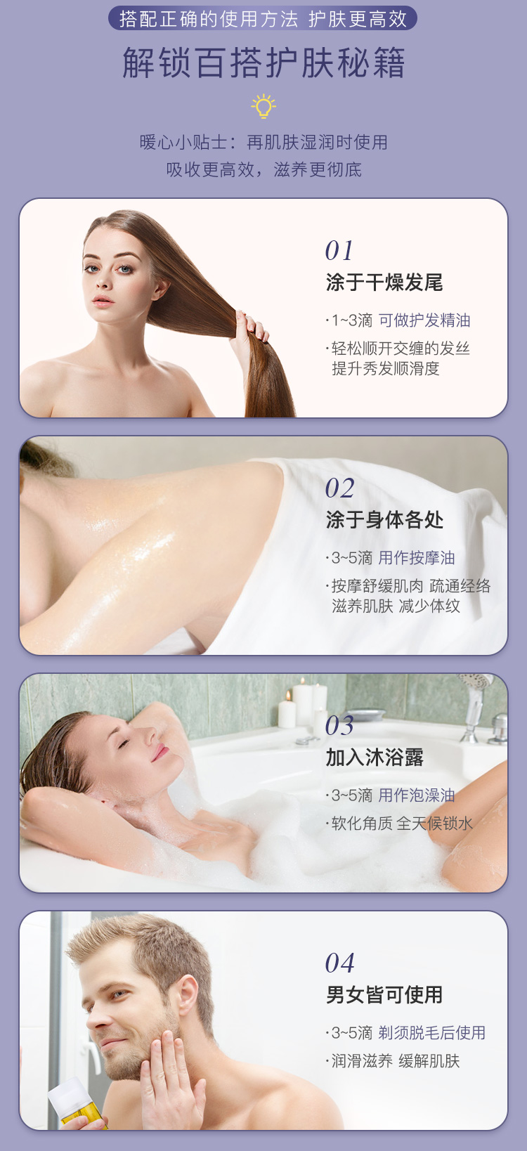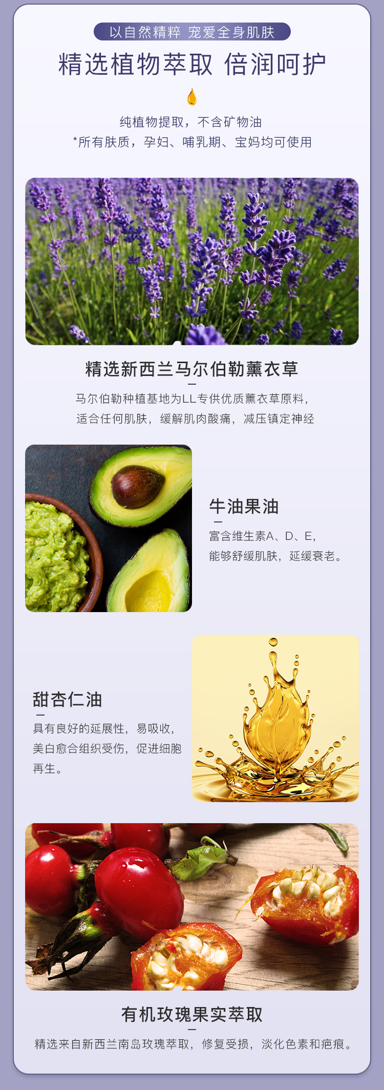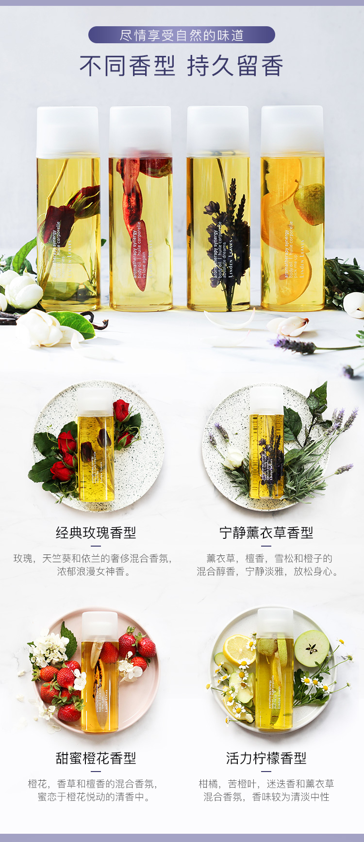 【产品介绍】 Linden Leaves 天然美白香体护理精油(薰衣草香型)纯天然植物提取,滋养并保持皮肤柔软和光泽有弹性。富含有机玫瑰果油,有机鳄梨油和维生素E,滋润干燥的皮肤,促进肌肤细胞更新。一个成熟的混合薰衣草、檀香水、雪松和橙色的平衡,平静和放松身心。帮助身心松弛,具安眠、舒缓作用与平衡效果。减轻皮肤老化与干燥现象。