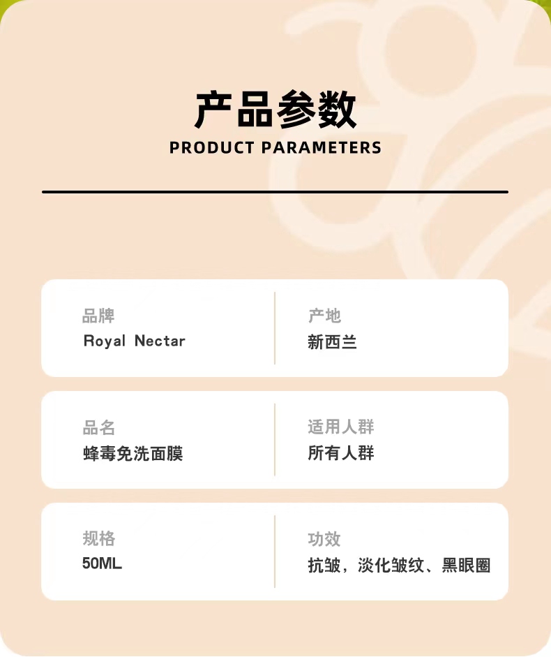 【产品介绍】Royal Nectar 皇家蜂毒面膜(抗皱紧肤/美白保湿)是一款快速的抗衰老的配方,具有保湿补水,洁肤美白功效的天然有机混合面膜。富含天然植物精华,麦卢卡蜂蜜和皇家蜂毒,有效深层清洁肌肤的同时,能持久保湿补水,具有超强抗氧化的能力。是面部瑕疵与黑头的终结者。长期使用能有效促进新陈代谢,预防皱纹,舒缓修护,活肤紧肤,抗菌消炎,细致毛孔,去黑头,保证肌肤健康红润。